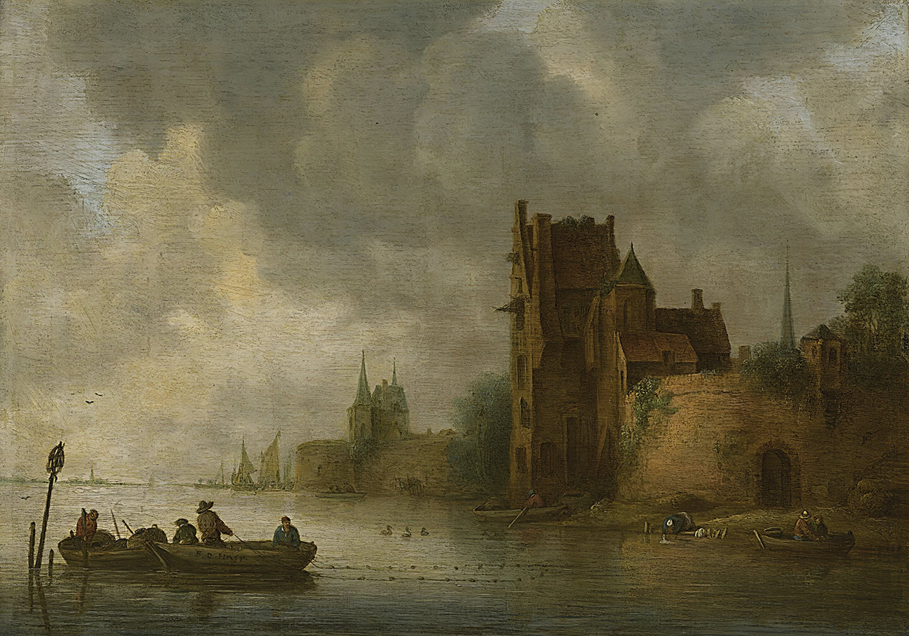 ₴ Репродукция пейзажа "Речной пейзаж с замком и рыбацкими лодками на переднем плане" - Хульст Франс де