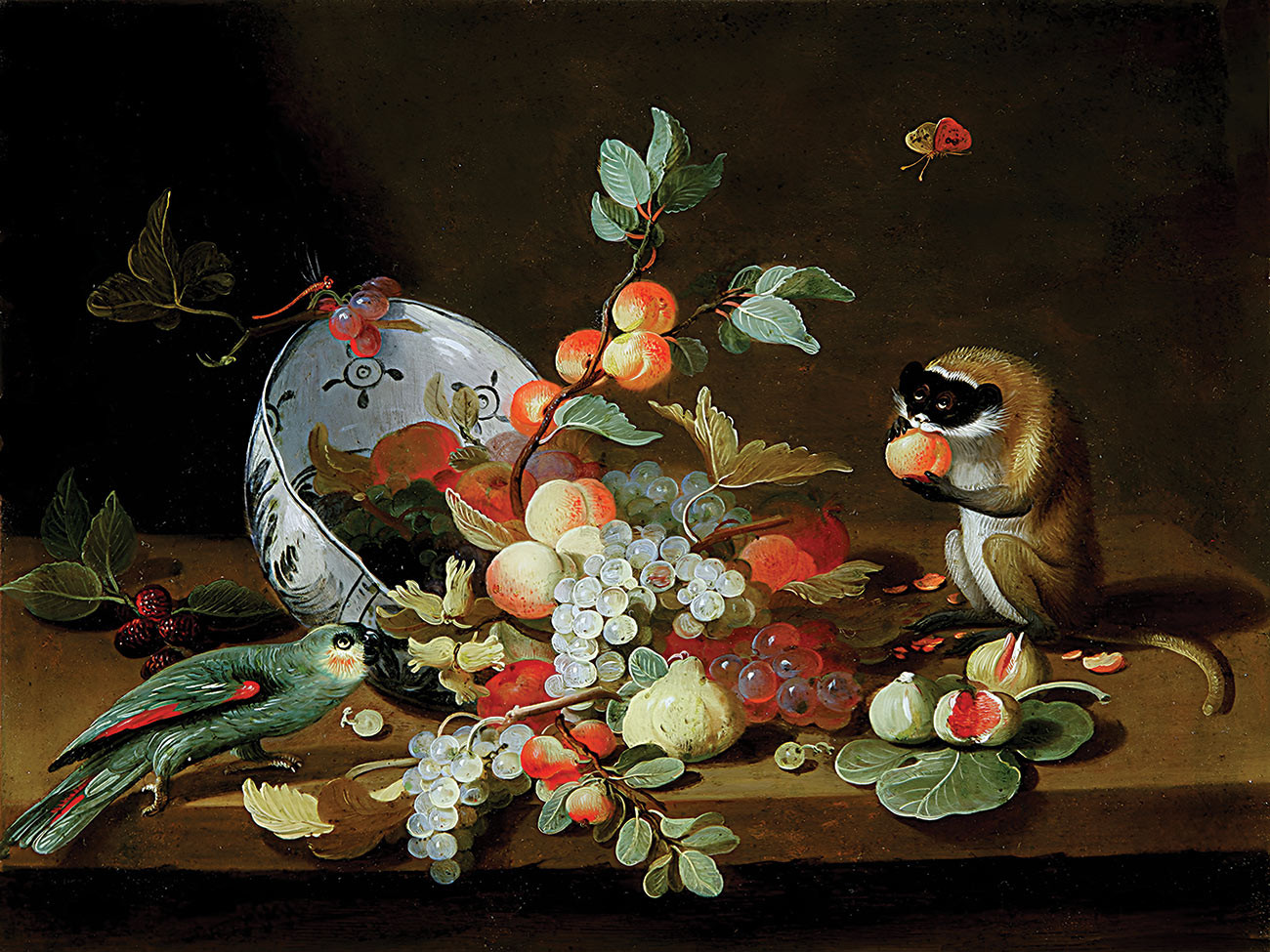 ₴ Репродукция натюрморт известного художника "Виноград и персики из опрокинутой делфтской миски, с ежевикой, инжиром, гранатами, виноградом, грушей и персиками на деревянном столе, с обезьяной и попугаем, наблюдающими за бабочкой" - Кессель Ян ван