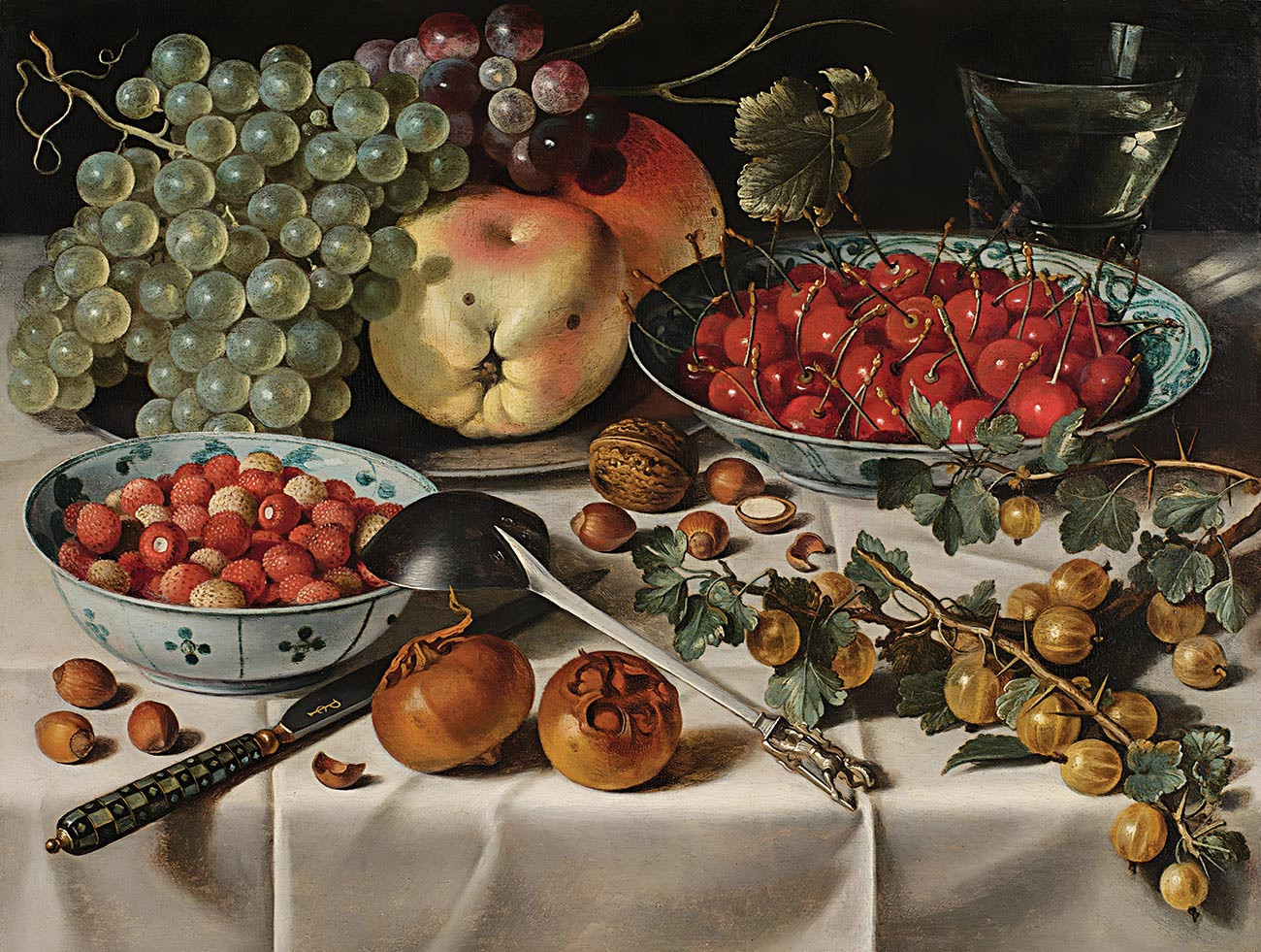купить репродукцию натюрморт известного художника Класа Питера — "Натюрморт с разнообразными фруктами, включая дикую клубнику и вишню, в двух фарфоровых мисках"