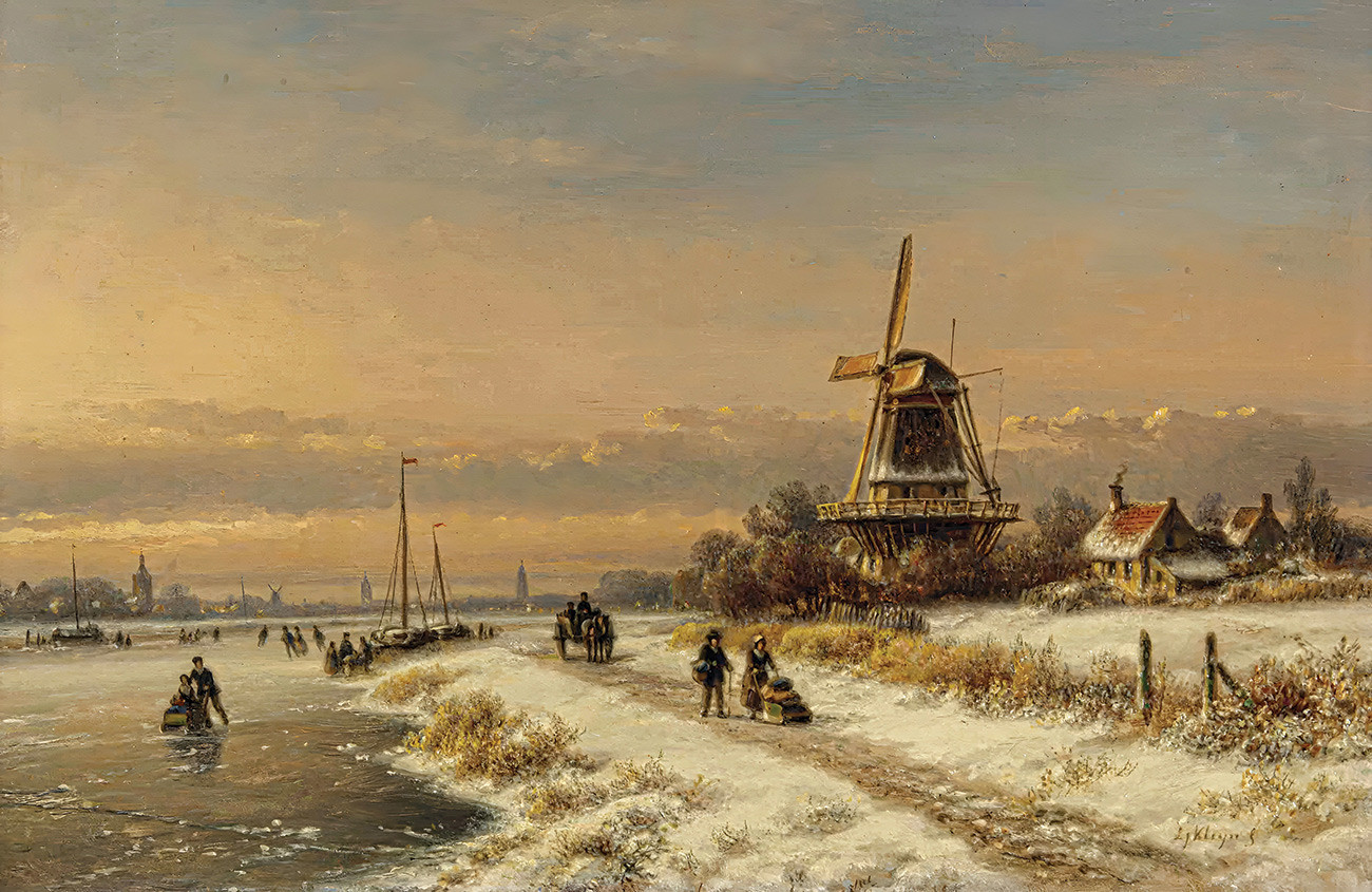 «Зимний пейзаж с конькобежцами у мельницы» Лодевейка Йоханнеса Кляйна с виртуозной точностью передает суть голландской зимы. На полотне изображена безмятежная сцена, залитая мягким, прохладным светом, характерным для свежего зимнего дня.