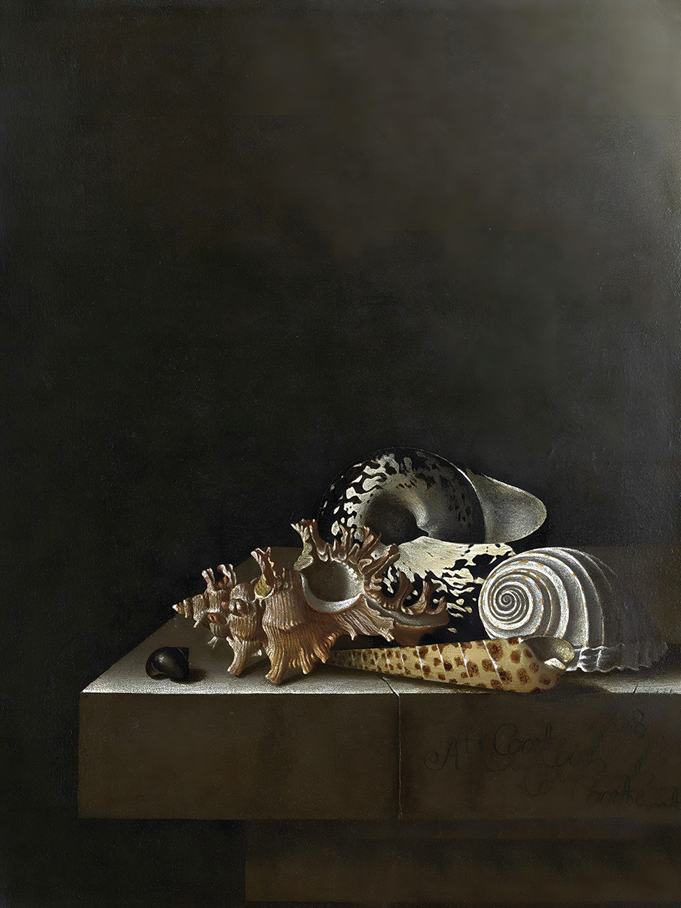 купите репродукцию натюрморт известного художника Коорта Андриана — "Ракушки на каменном постаменте"