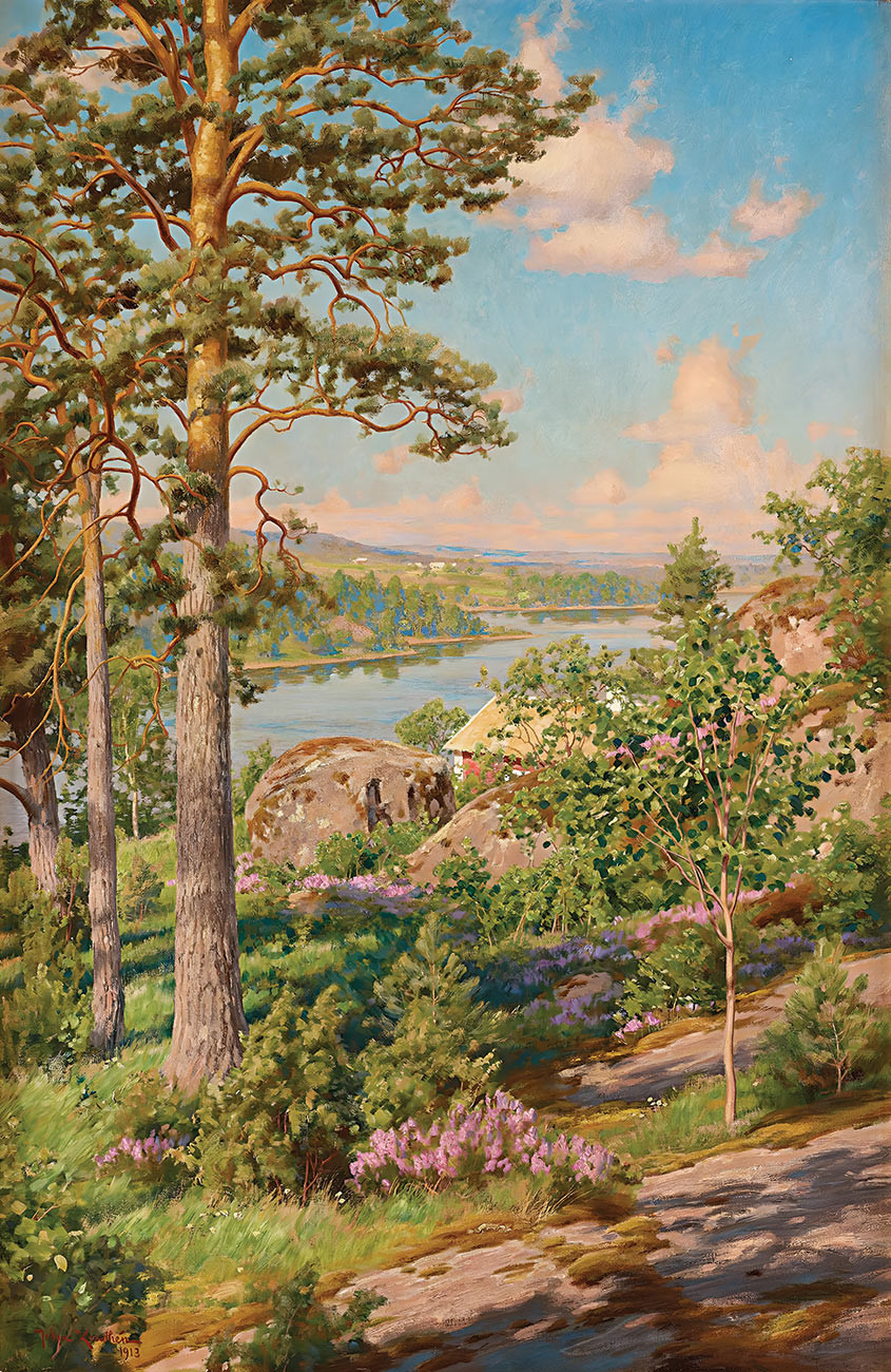 репродукция пейзажа художника Кретена Йохана — "Озерный пейзаж в летнем великолепии"