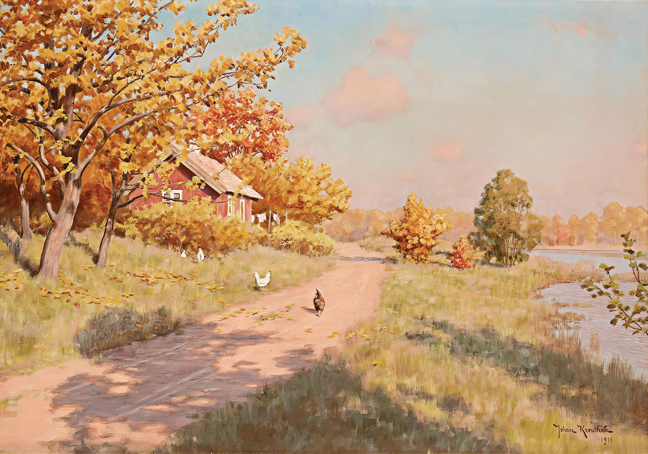 репродукция пейзажа художника Кретена Йохана — "Осенний пейзаж с курами"