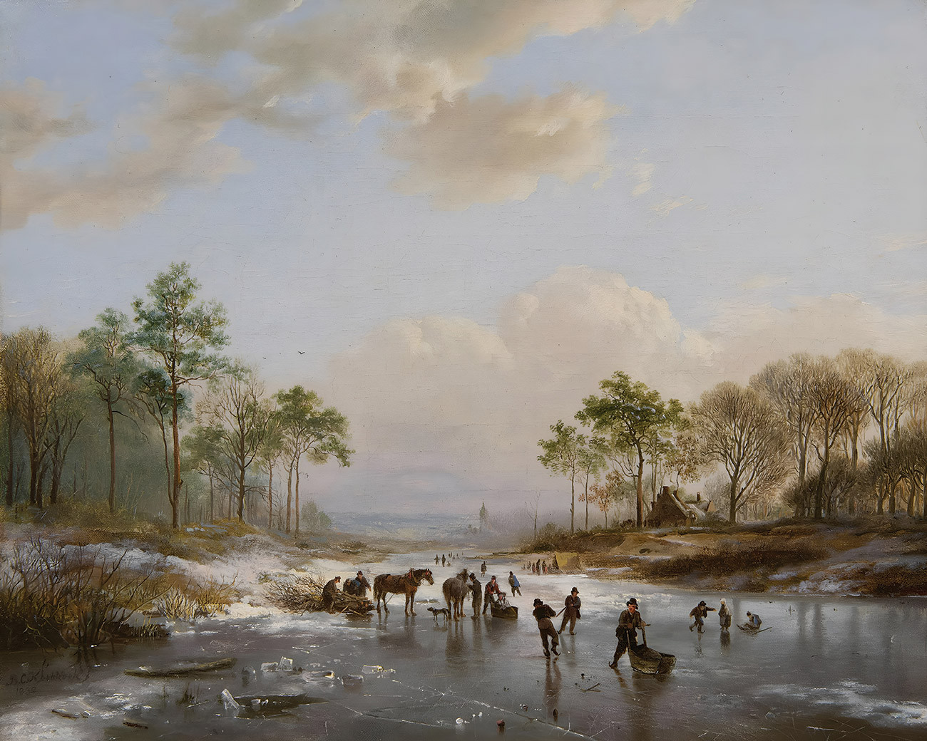 репродукция пейзажа известного художника Куккук Баренда Корнелиса — "Конькобежцы и сборщики дров на замерзшей реке"