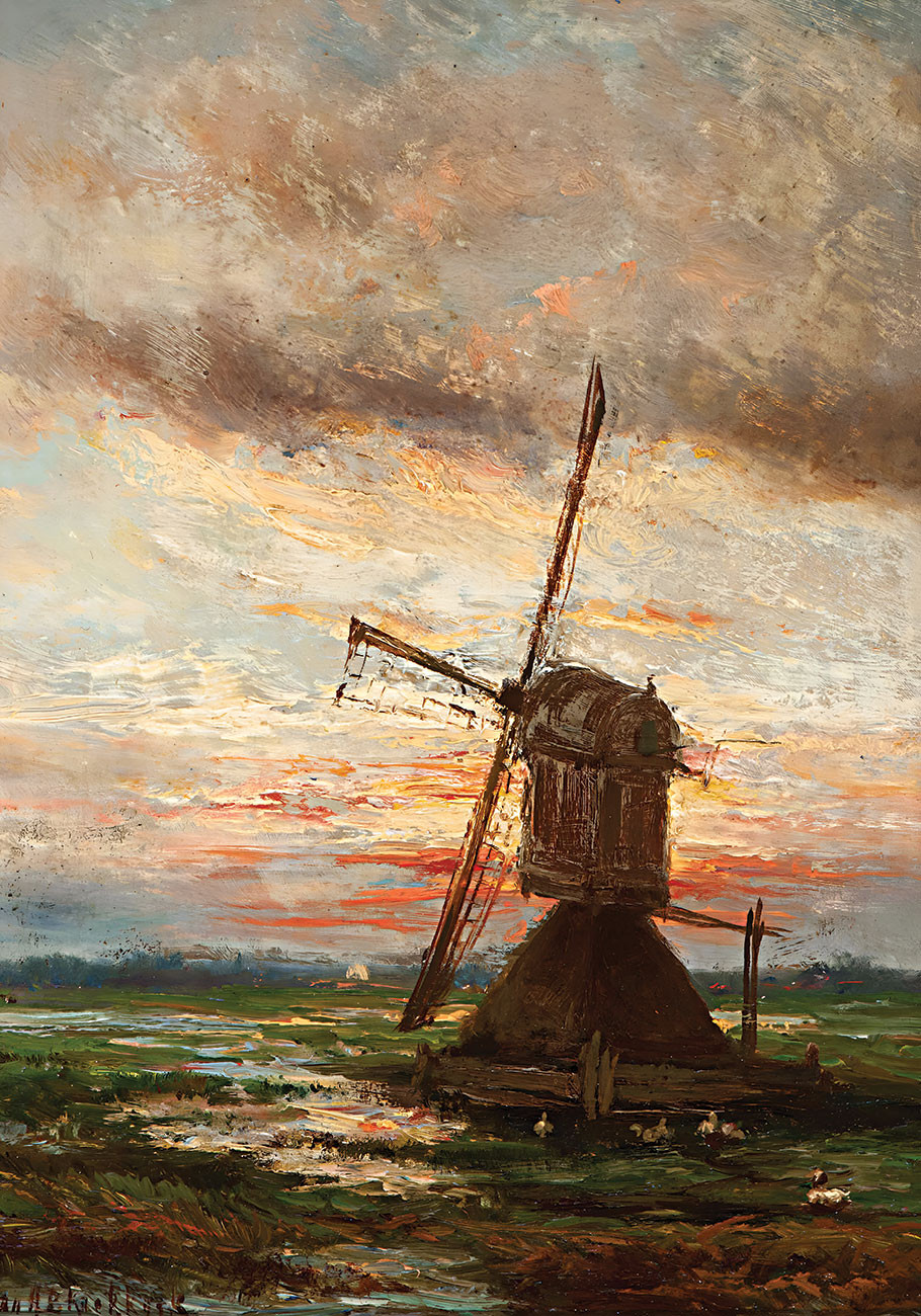 репродукция пейзажа художника Куккука Йоханнеса Хермануса Баренда — "Мельница на закате"