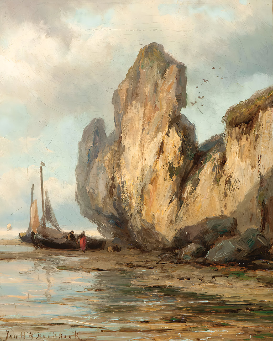 ⚓Репродукция морской пейзаж "Рыбацкая лодка на английском пляже со скалистым берегом" - Куккук Йоханнес Херманус Баренд