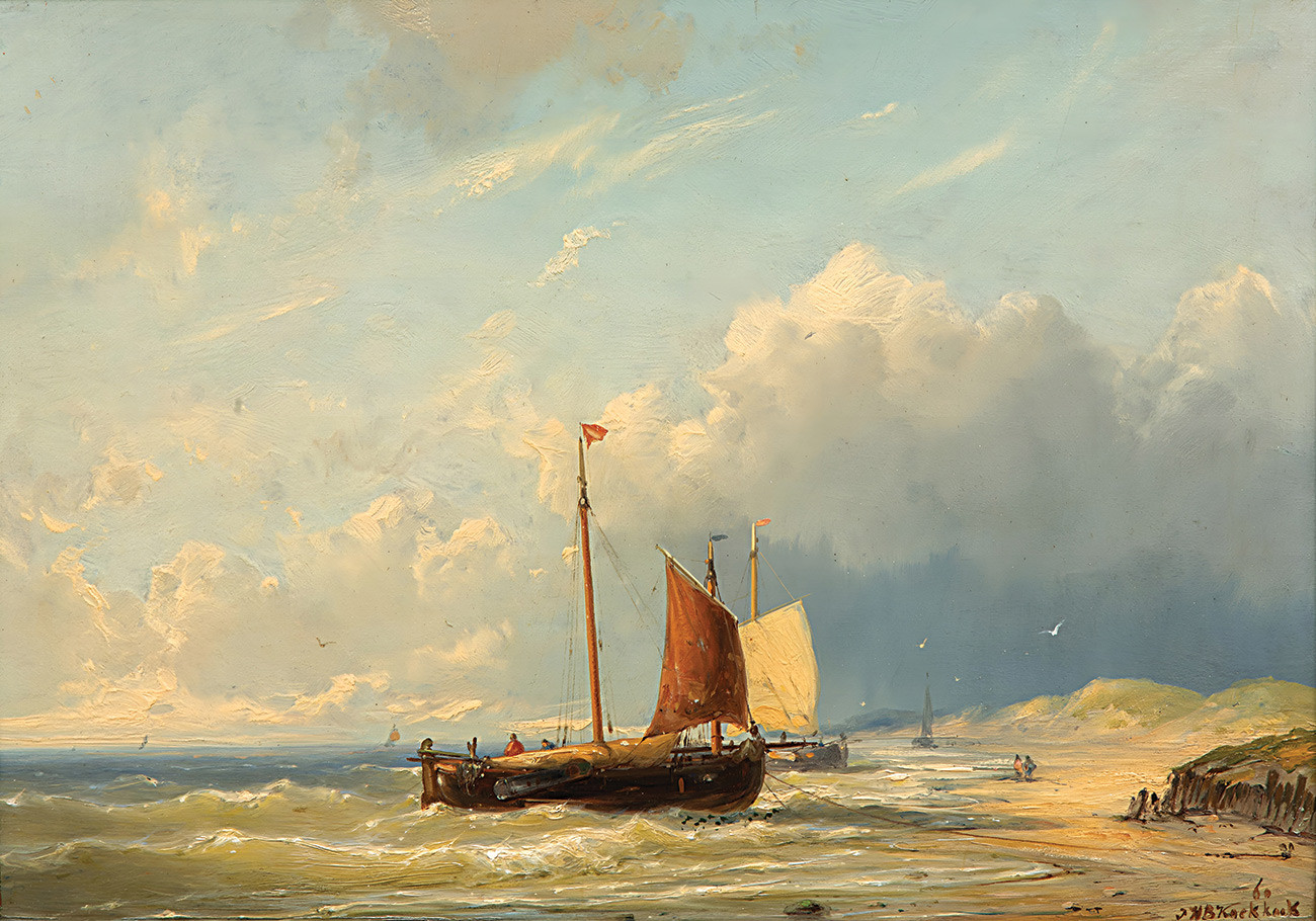 репродукция морского пейзажа художника Куккука Йоханнеса Хермануса Баренда — "Рыбацкие лодки на пляже"