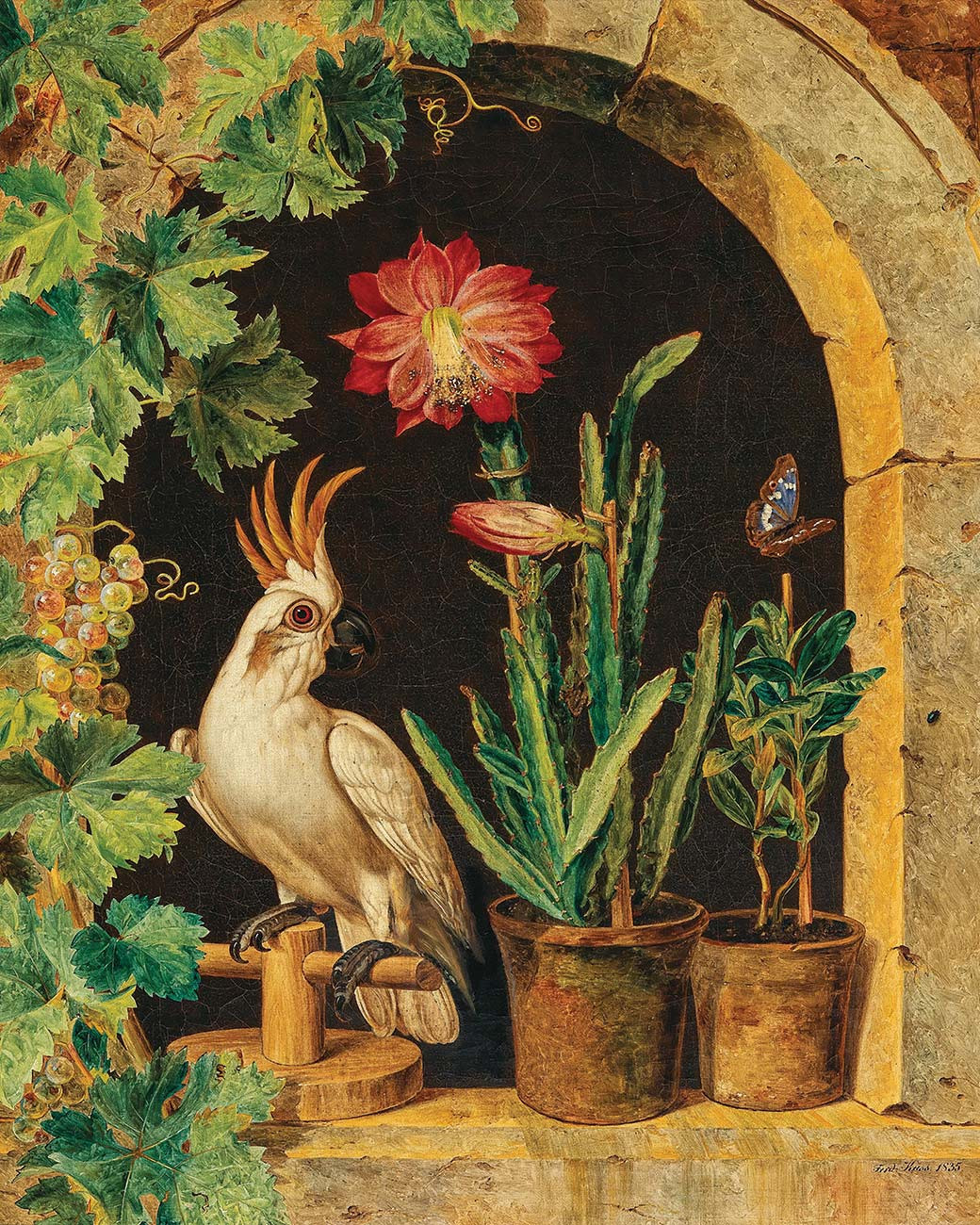 купить репродукцию натюрморт художника Кусс Фердинанда — "Какаду у окна с цветущим кактусом и бабочкой"