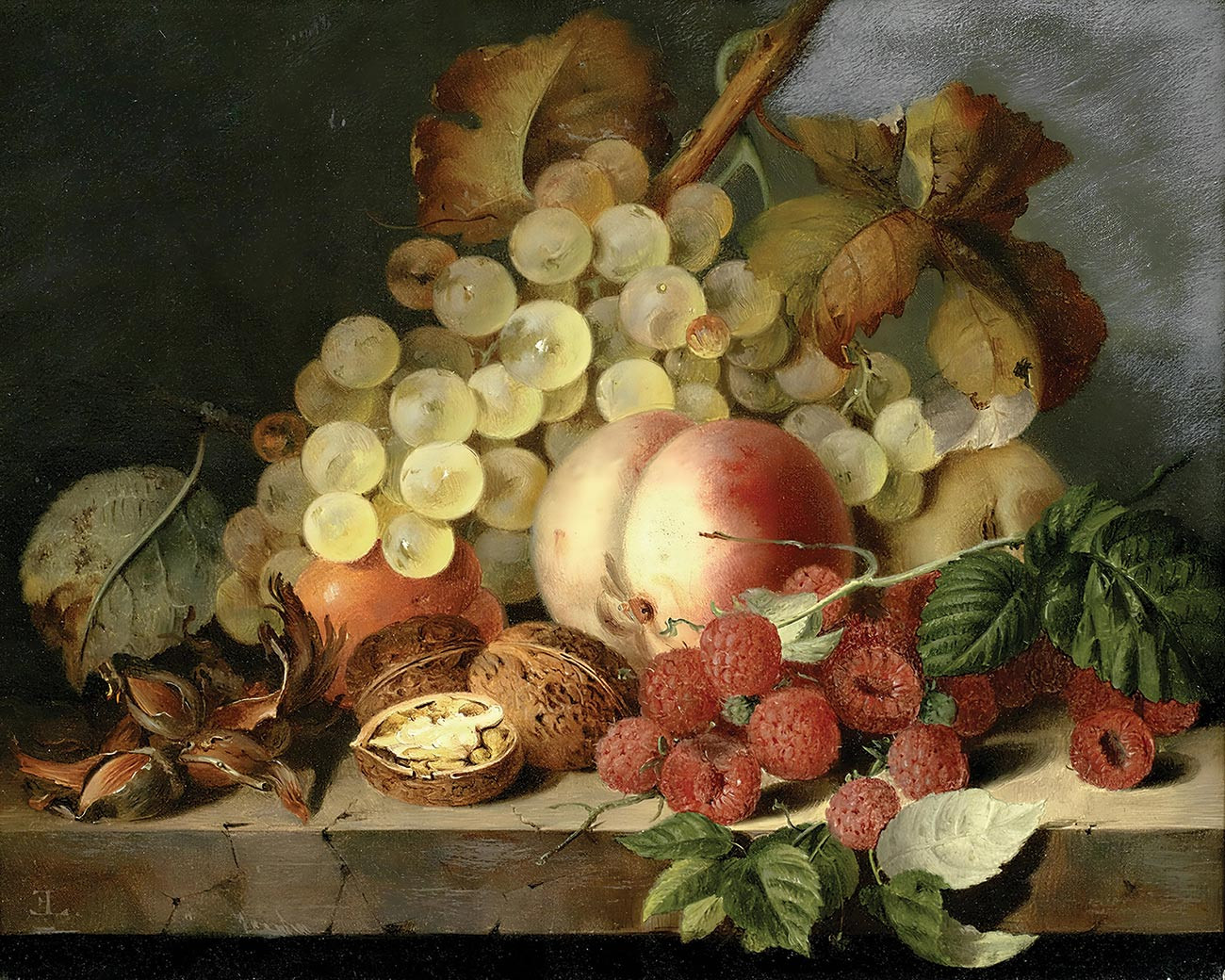 ₴ Репродукция натюрморт "Натюрморт с фруктами, ягодами и орехами" - Ладелл Эдвард