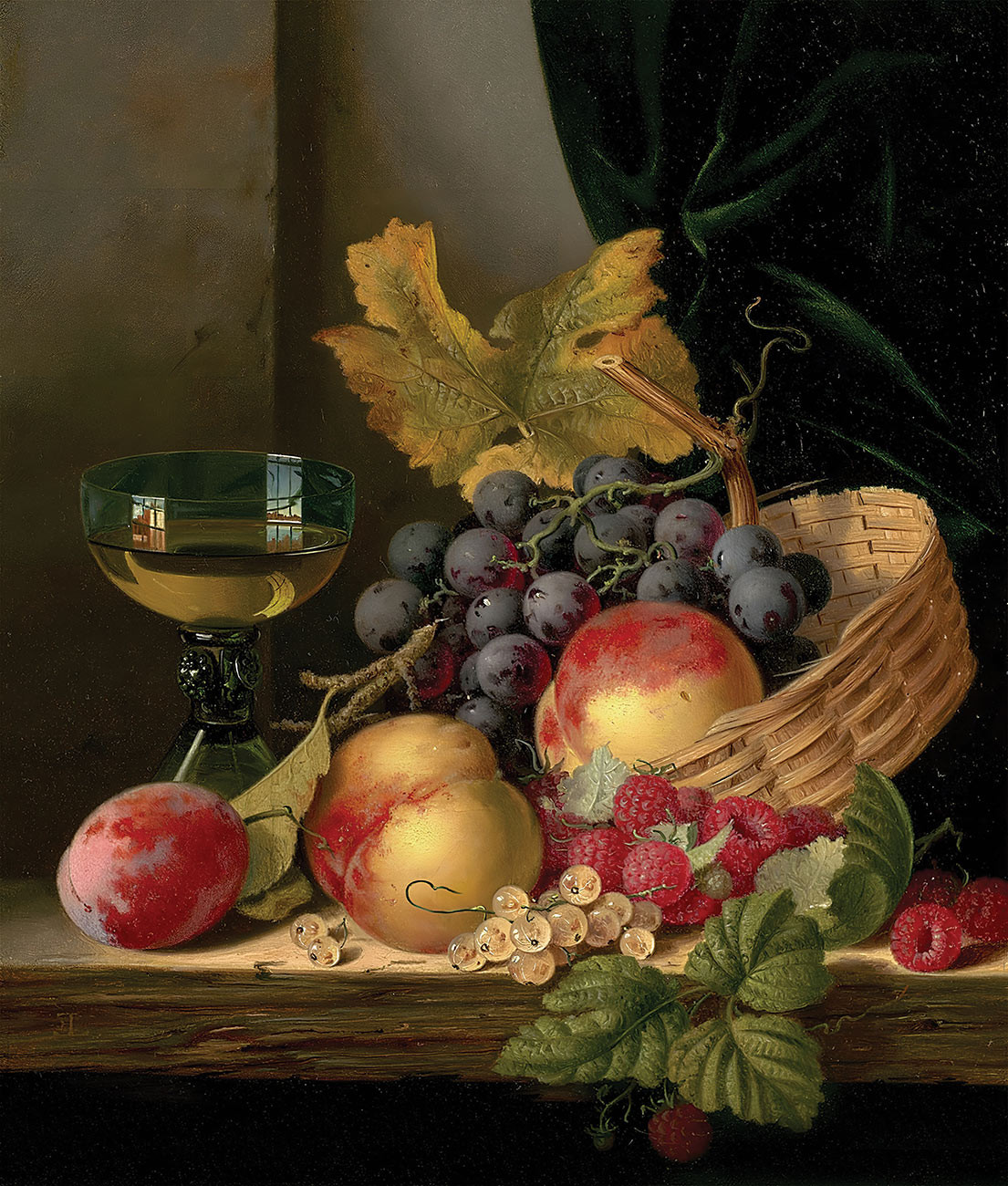 ₴ Репродукция натюрморт "Натюрморт с бокалом и плетеной корзиной с фруктами" - Ладелл Эдвард