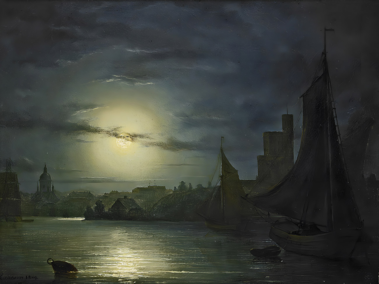 ₴ Репродукция пейзаж известного художника "Вид из Бекхольмена против Кастельхольмена и Седермальма - Стокгольм в лунном свете" - Ларсон Маркус Симеон