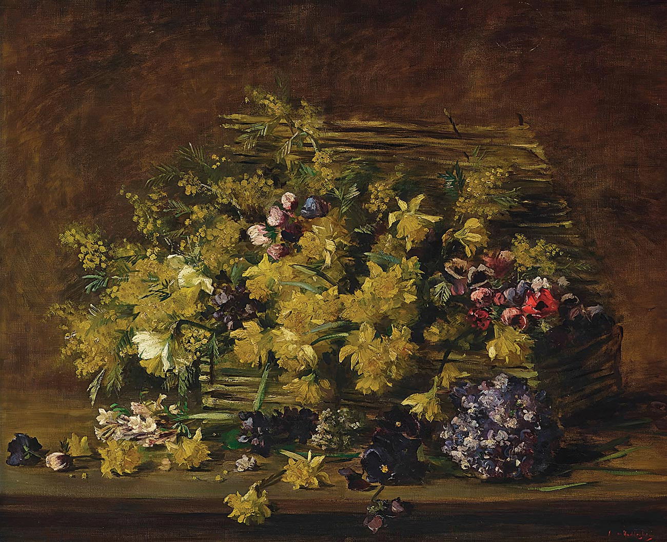 ₴ Репродукция цветочный натюрморт "Нарциссы и другие цветы в корзине" - Лонгпре Пауль де