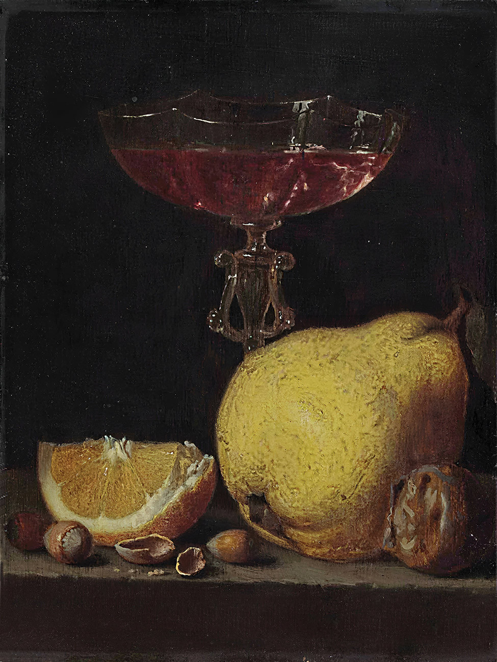 ₴ Репродукция натюрморт "Венецианский бокал, четвертинка апельсина, желуди, айва и мушмула на каменном выступе" - Люттичуйс Саймон