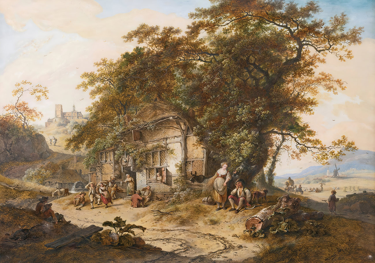 репродукция пейзажа художника Мейера Хендрика — "Обширный пейзаж с крестьянами, отдыхающими перед таверной, другими, собирающими урожай вдали, и церковью на холме"