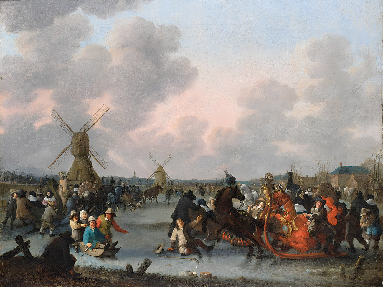 репродукция пейзажа художника Мейера Хендрика — "Конькобежцы и украшенные конные сани на замерзшей реке с ветряными мельницами и городом за ними"