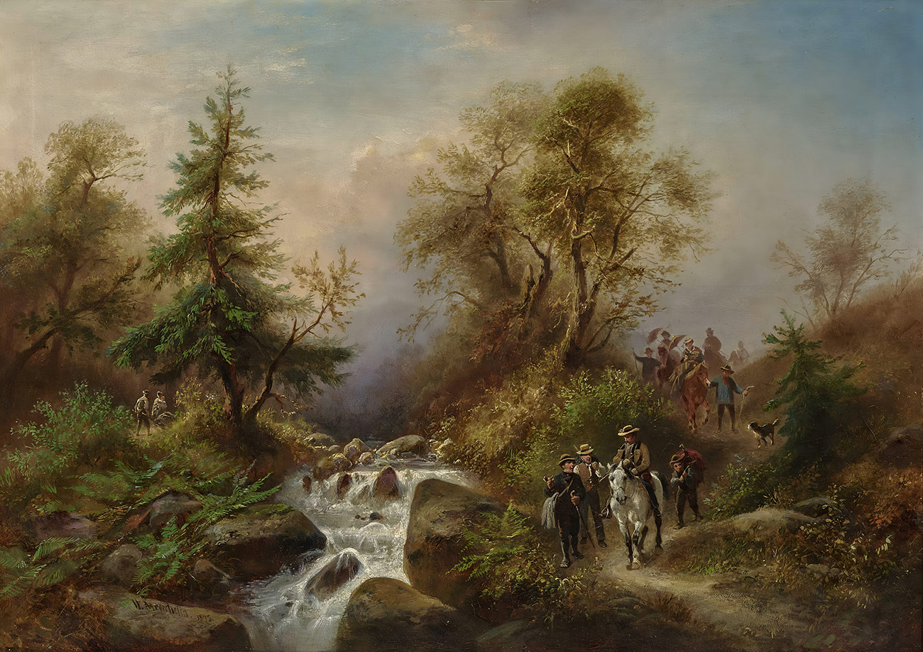 репродукция пейзажа художника Мейерхайма Вильгельма — "Гарцский пейзаж с туристической компанией"