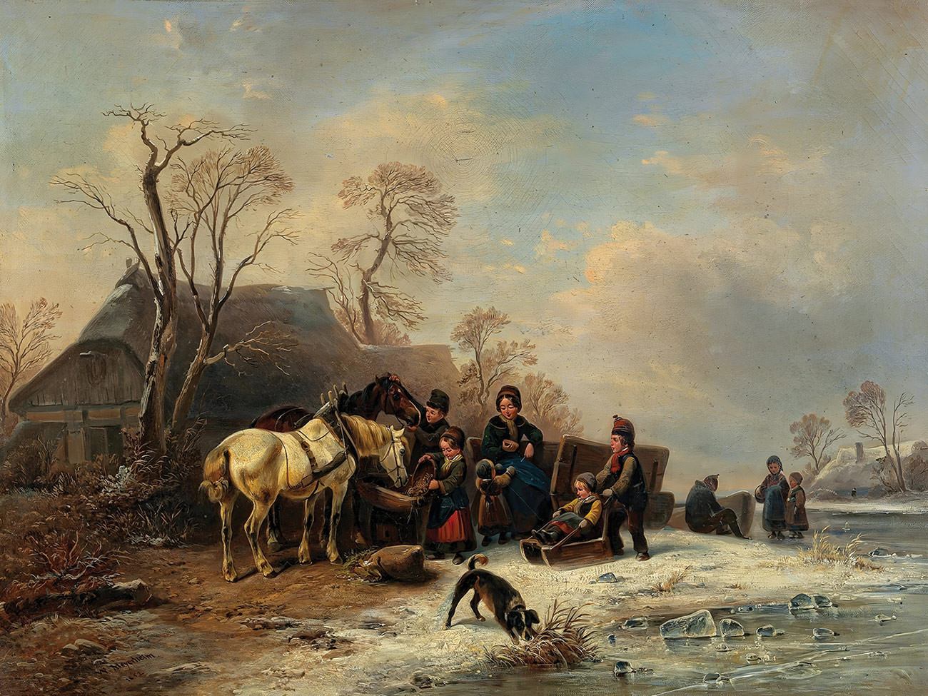 репродукция картины художника Мейерхайма Вильгельма — "Зимняя сцена с детьми и лошадьми"