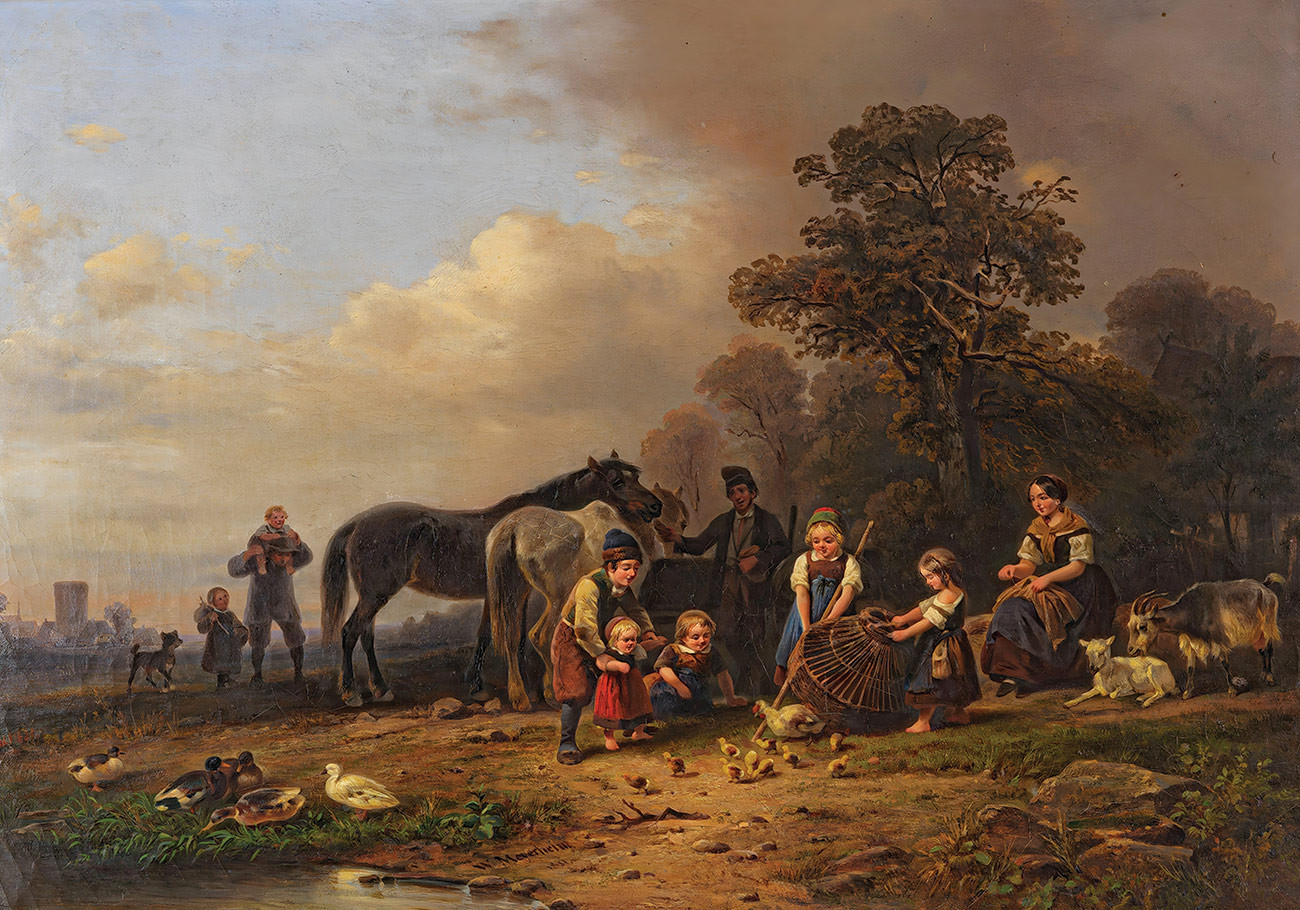 ₴ Репродукция бытовой жанр "Фермерская семья с корзиной молодых цыплят" - Мейерхайм Вильгельм Александр
