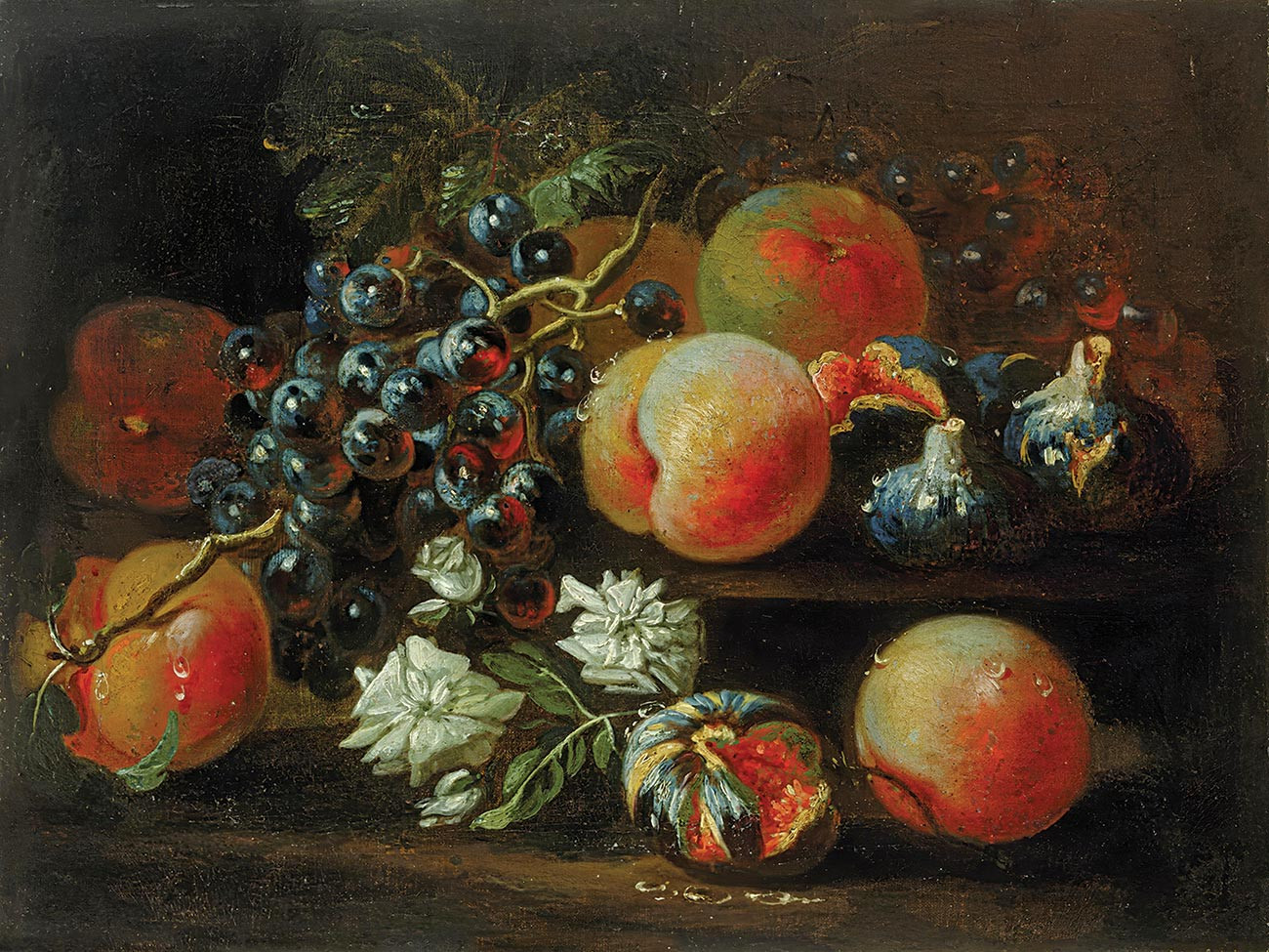 ₴ Репродукция натюрморт "Натюрморт с персиками, виноградом, инжиром и цветами" - Наварра Пьетро