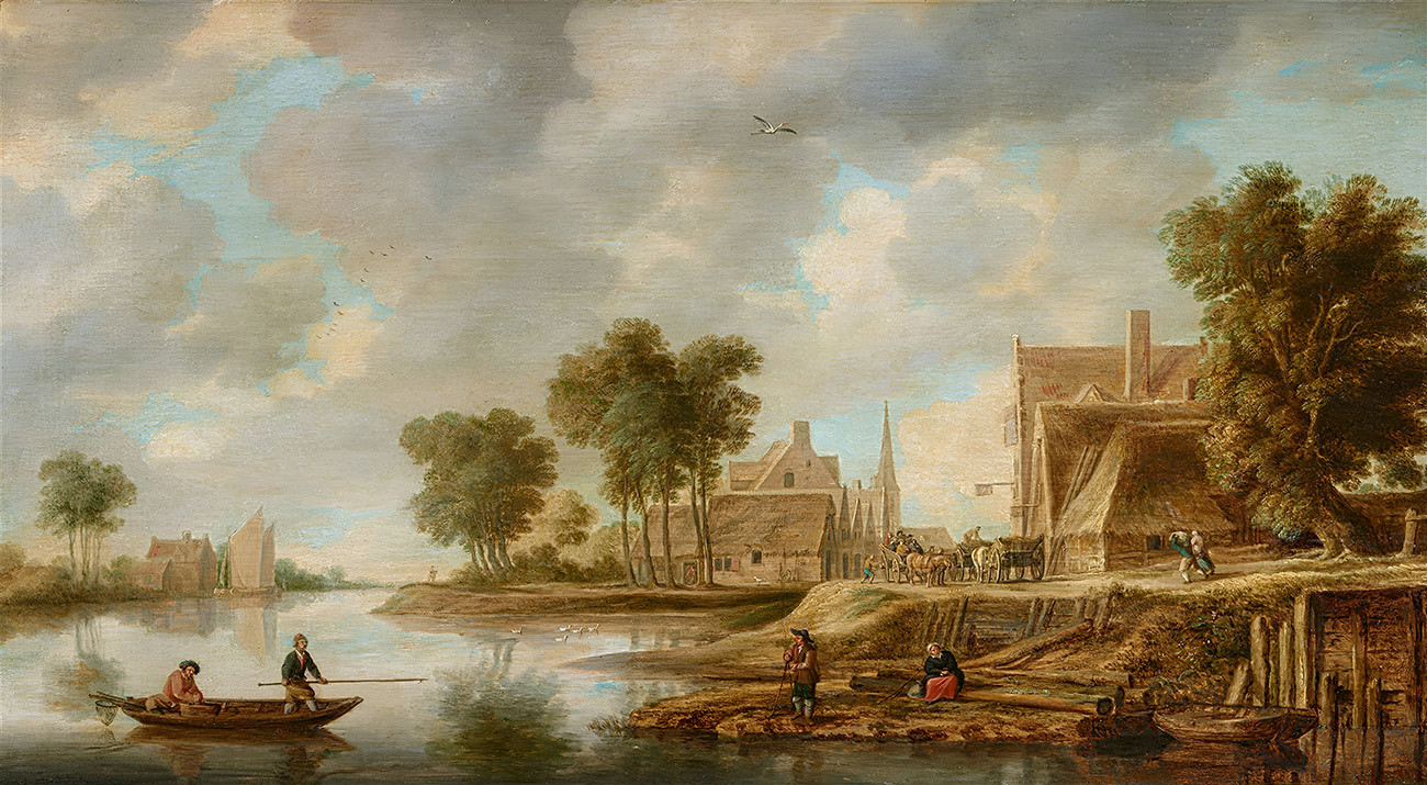 репродукция пейзажа художника Нера Арта — "Речной пейзаж с деревней, перед которой стоят две конные тележки"
