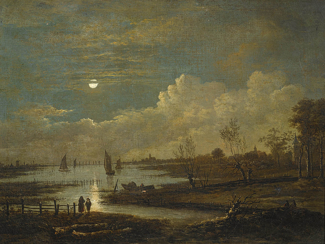 репродукция пейзажа художника Нера Арта — "Широкий речной пейзаж в лунном свете"
