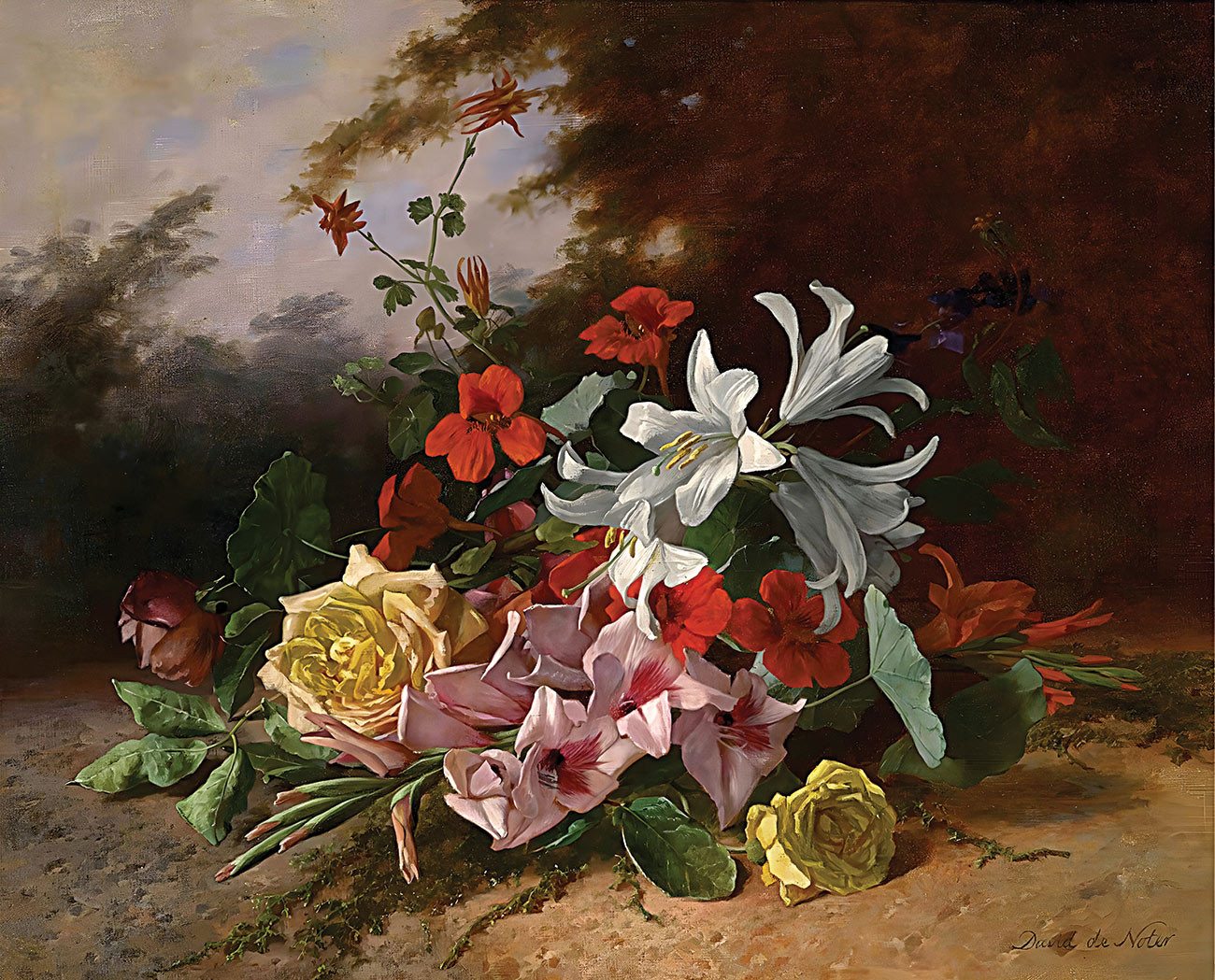 купите репродукцию цветочный натюрморт художника Нотера Давида — "Розы гладиолусы и лили"
