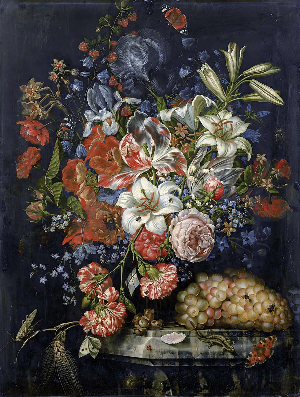 ₴ Репродукция цветочный натюрморт "Натюрморт с цветами и фруктами" - Оттмар Еллигер Младший