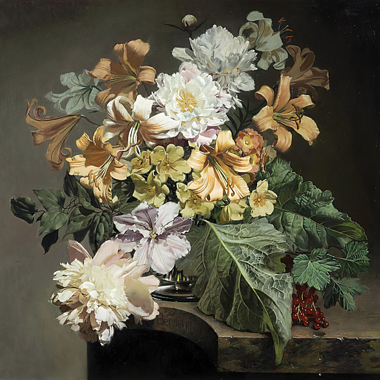 купите репродукцию цветочный натюрморт художника Оутса Беннетта — "Натюрморт с цветами в стеклянной вазе на мраморном выступе"