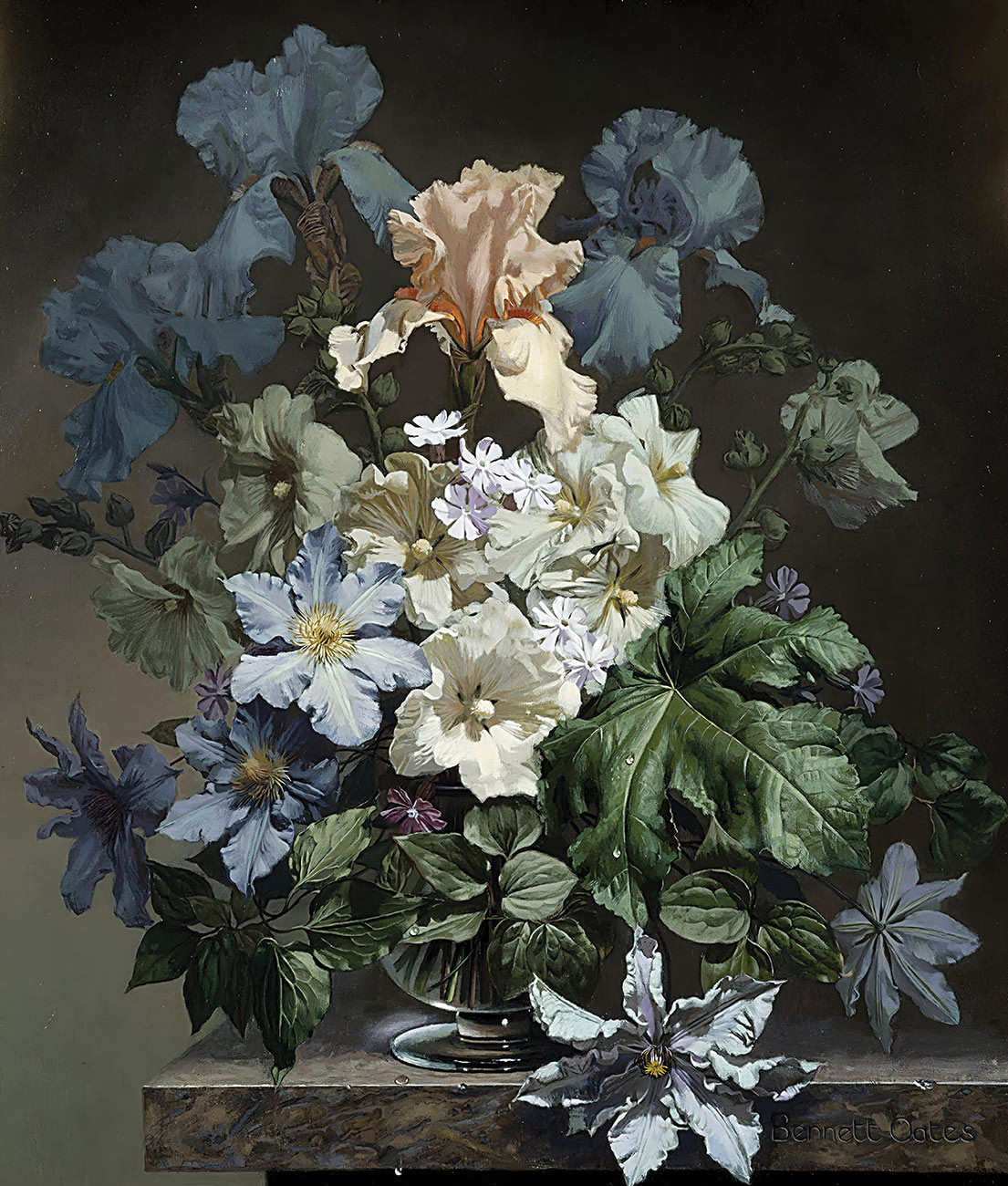 ₴ Репродукция натюрморт "Натюрморт с цветами в стеклянной вазе на мраморном выступе" - Оутс Беннетт