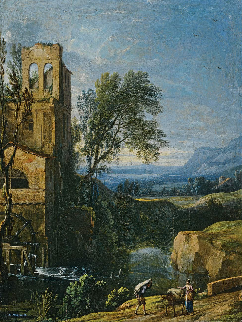 репродукция пейзажа художника Пателя Пьер-Антуана — "Речной пейзаж с водяной мельницей и фигурами и ослом на переднем плане"