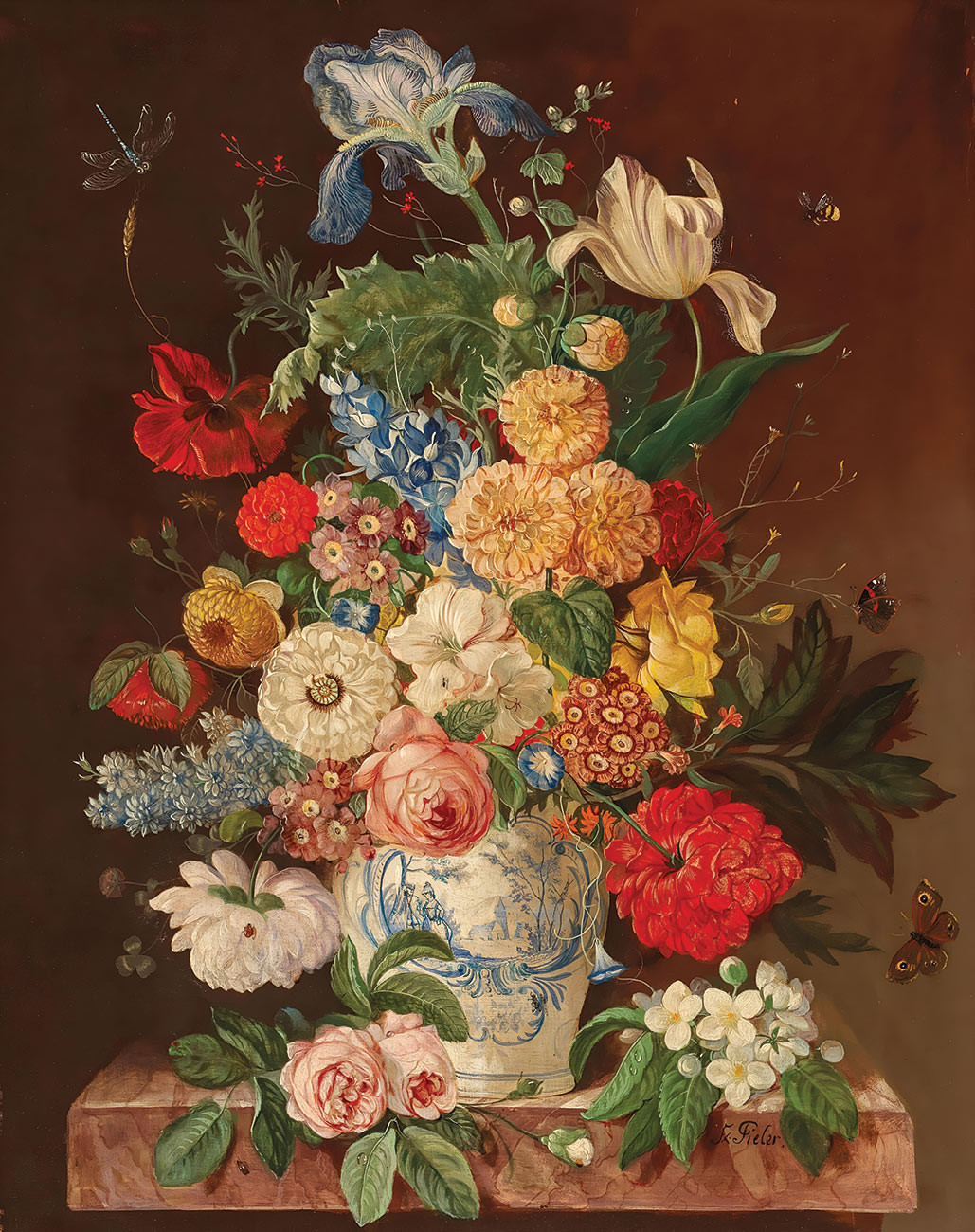 купите репродукцию натюрморт известного художника Пилера Франца — "Большой букет цветов со стрекозой и бабочками"