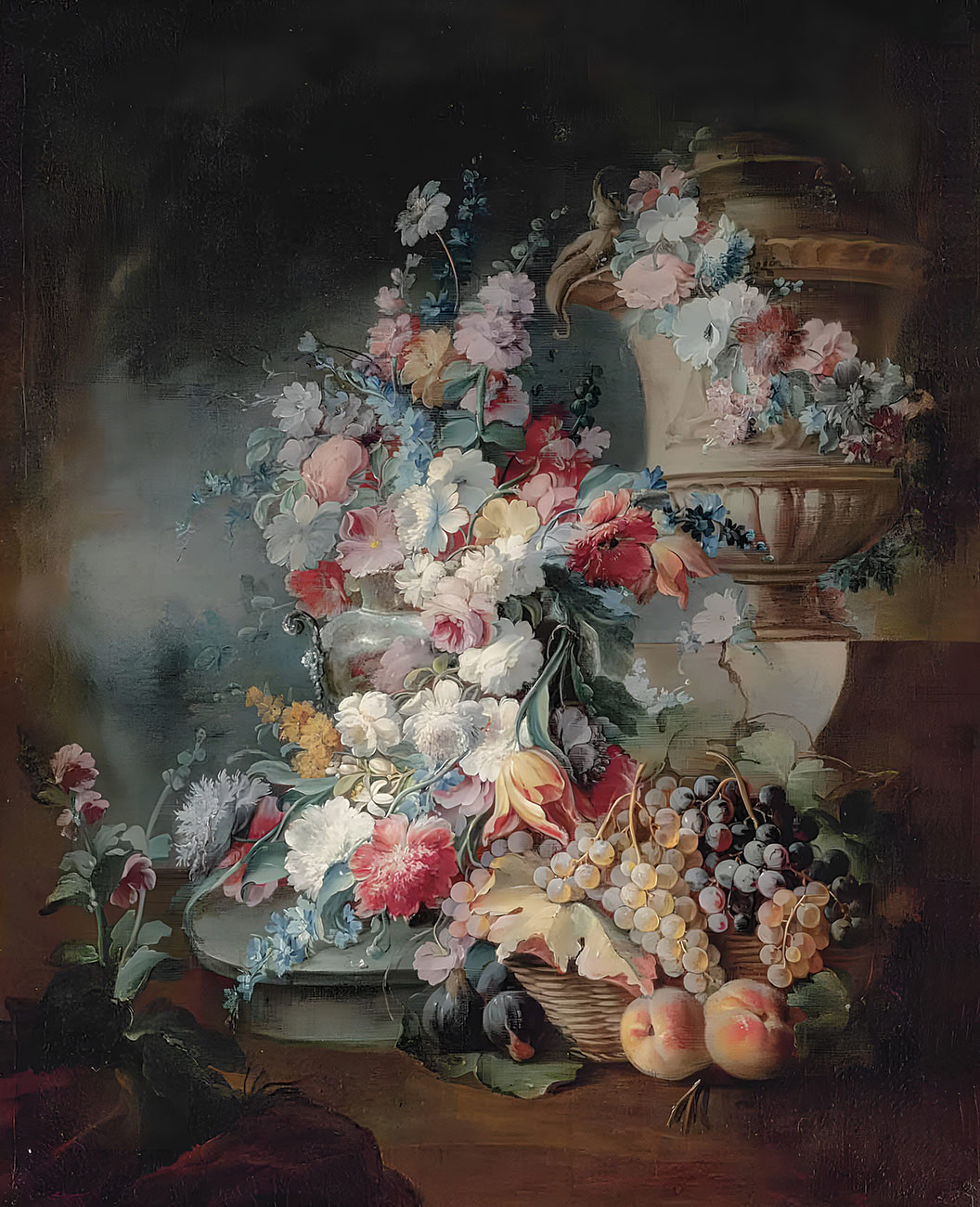 ₴ Репродукция цветочный натюрморт известного художника "Розы, березки, маки и другие цветы в серебряном весе рядом со скульптурной урной на каменном выступе, виноград и персики в плетеной корзине и инжир в пейзаже" - Рапоус Мишель Антонио