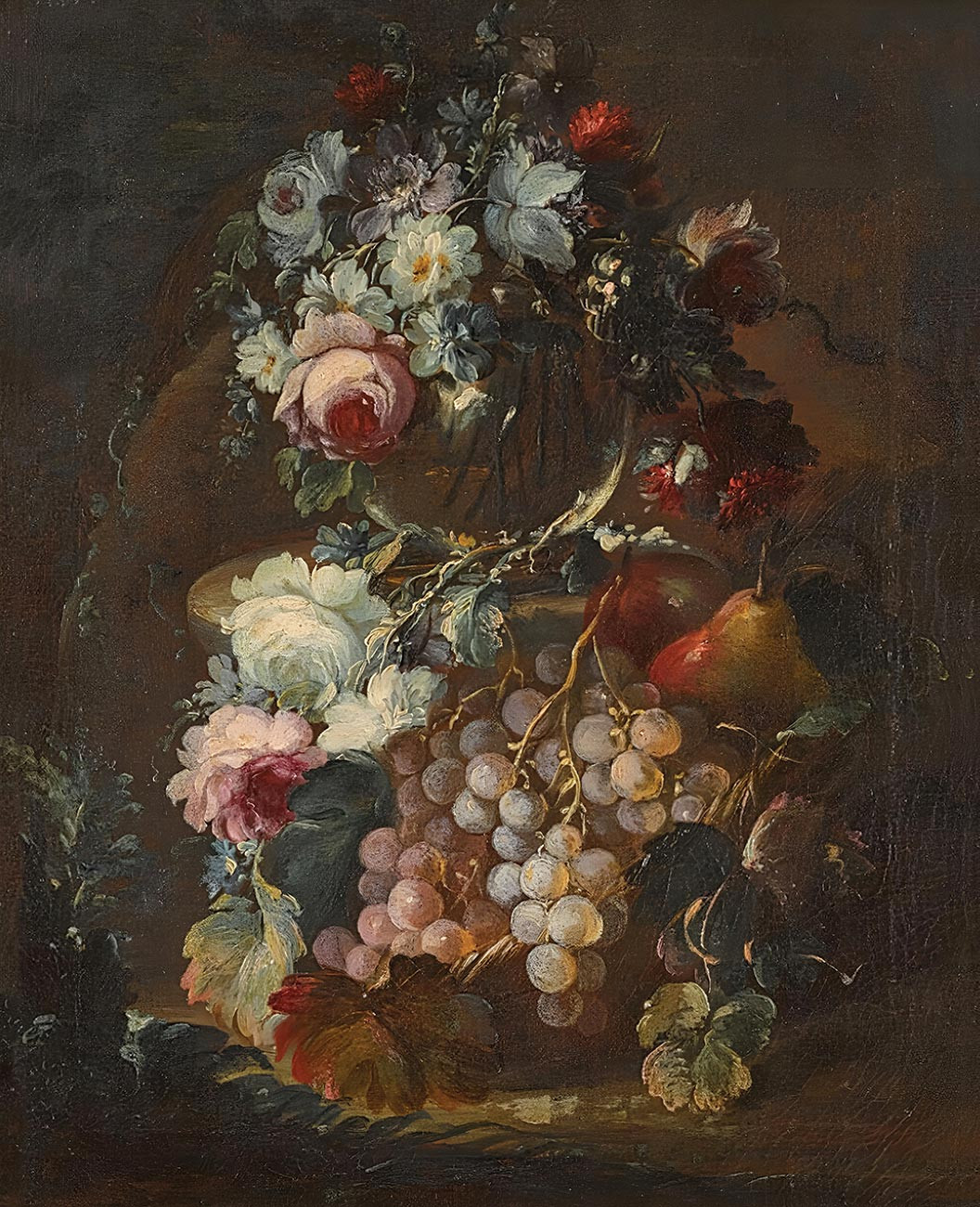 ₴ Репродукция цветочный натюрморт известного художника "Натюрморт с цветами в стеклянной вазе, виноградом и грушами" - Рапоус Мишель Антонио