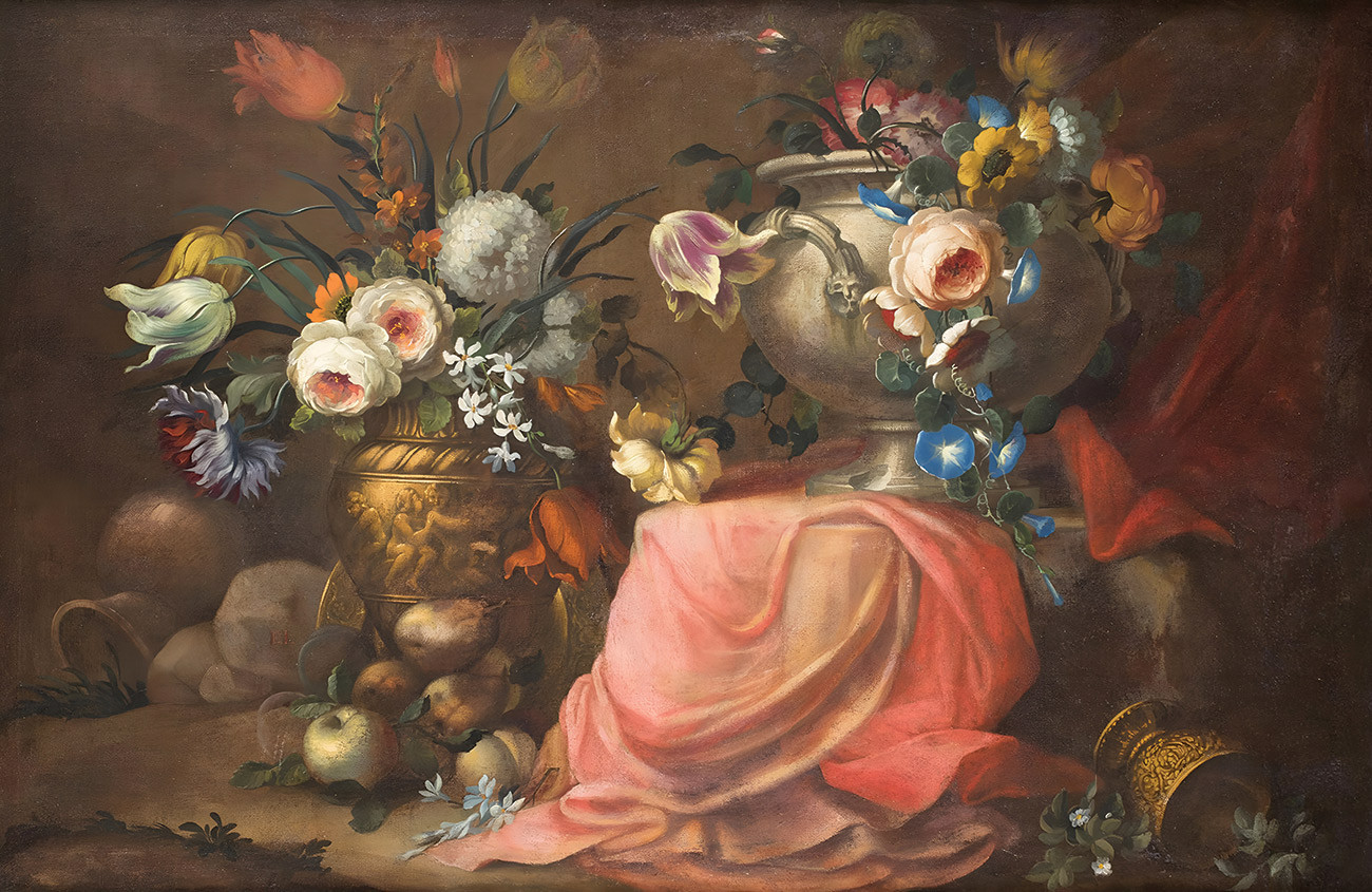 ₴ Репродукция цветочный натюрморт известного художника "Натюрморт с цветами с классическими вазами и красной тканью" - Рапоус Мишель Антонио