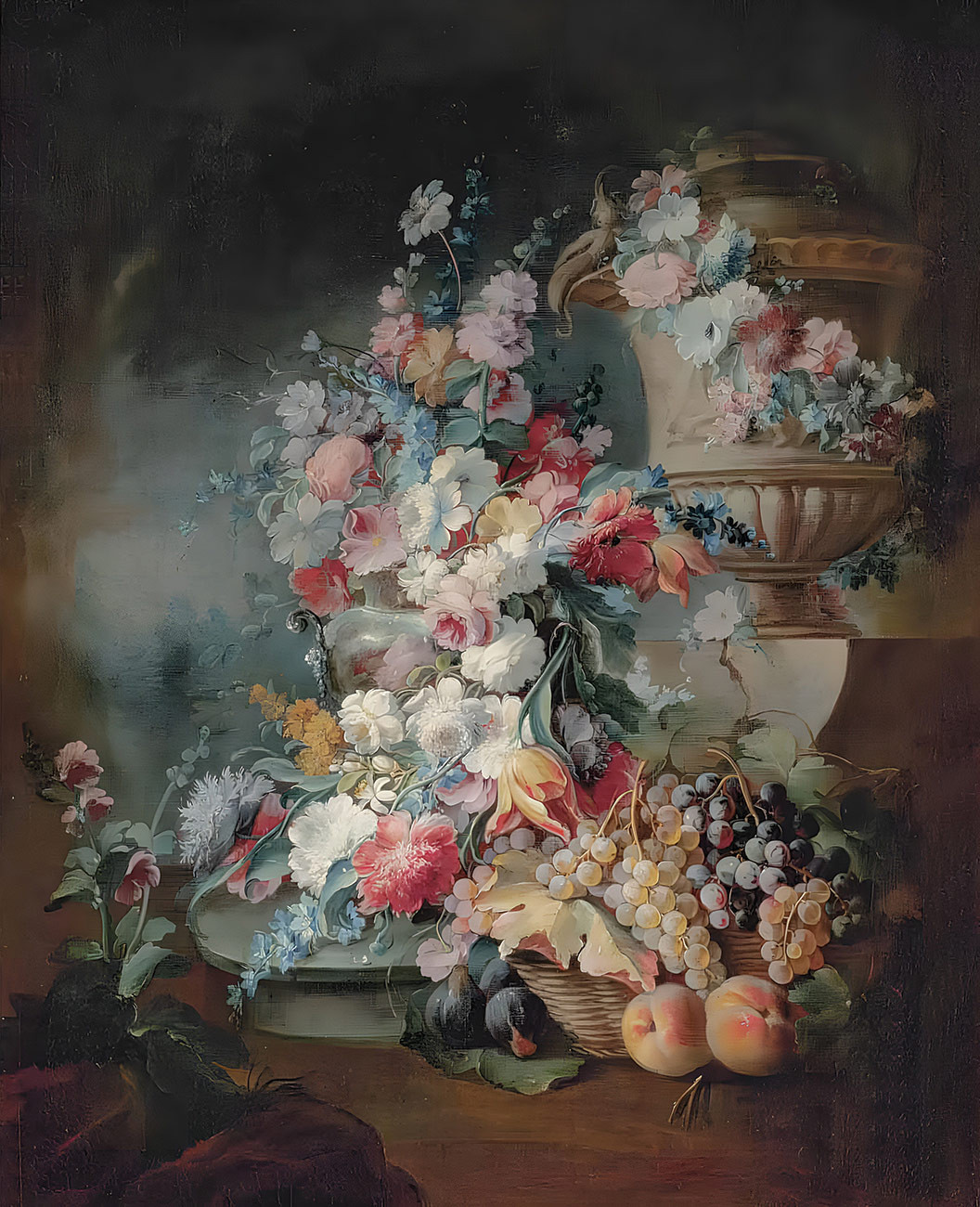 ₴ Репродукция цветочный натюрморт известного художника "Тюльпаны, розы, маки, березки и другие цветы в скульптурной урне на каменном выступе, виноград и персики на медной тарелке в пейзаже" - Рапоус Мишель Антонио