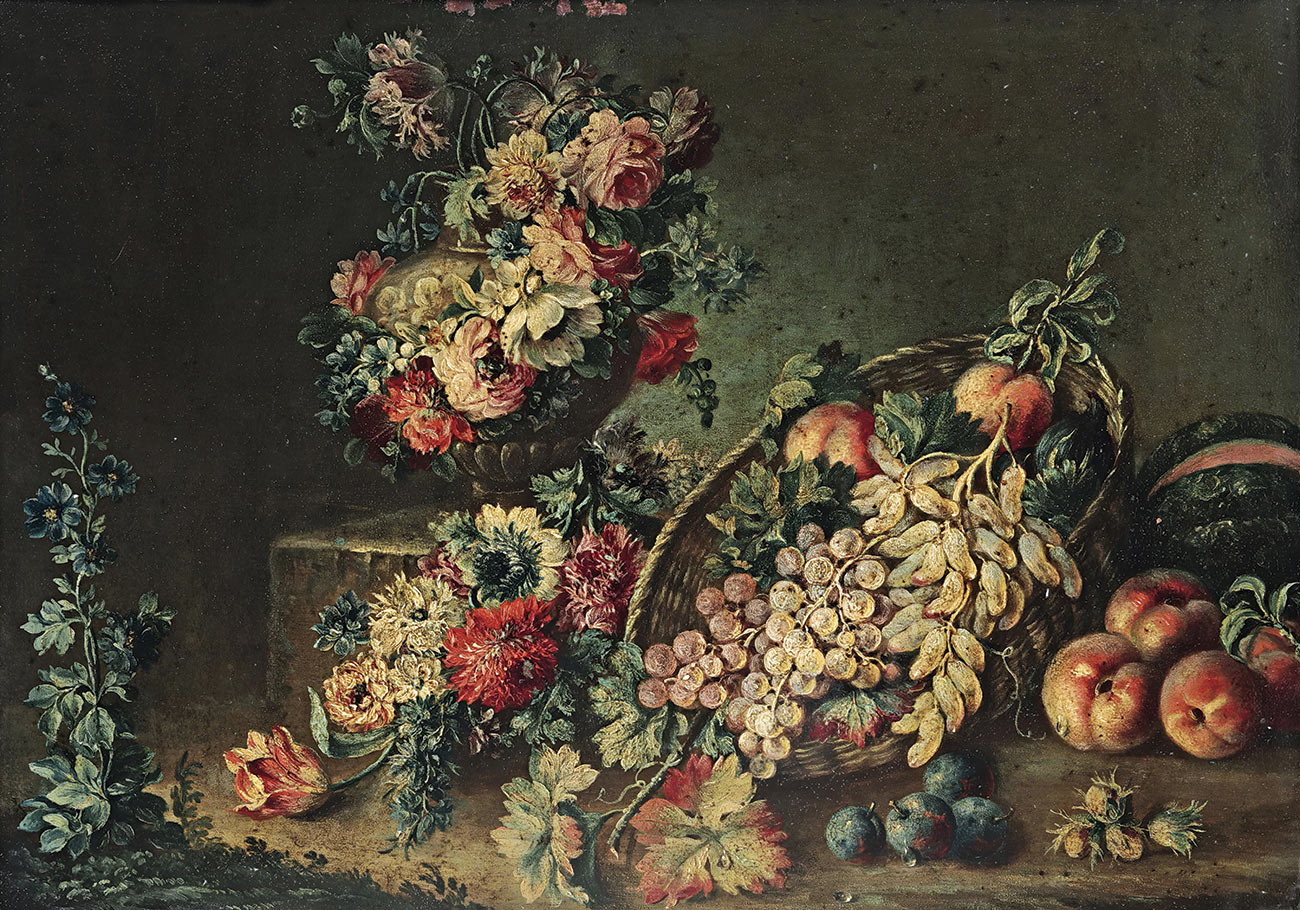 ₴ Репродукция цветочный натюрморт известного художника "Натюрморт с корзинами, полными фруктов и вазами с цветами" - Рапоус Мишель Антонио