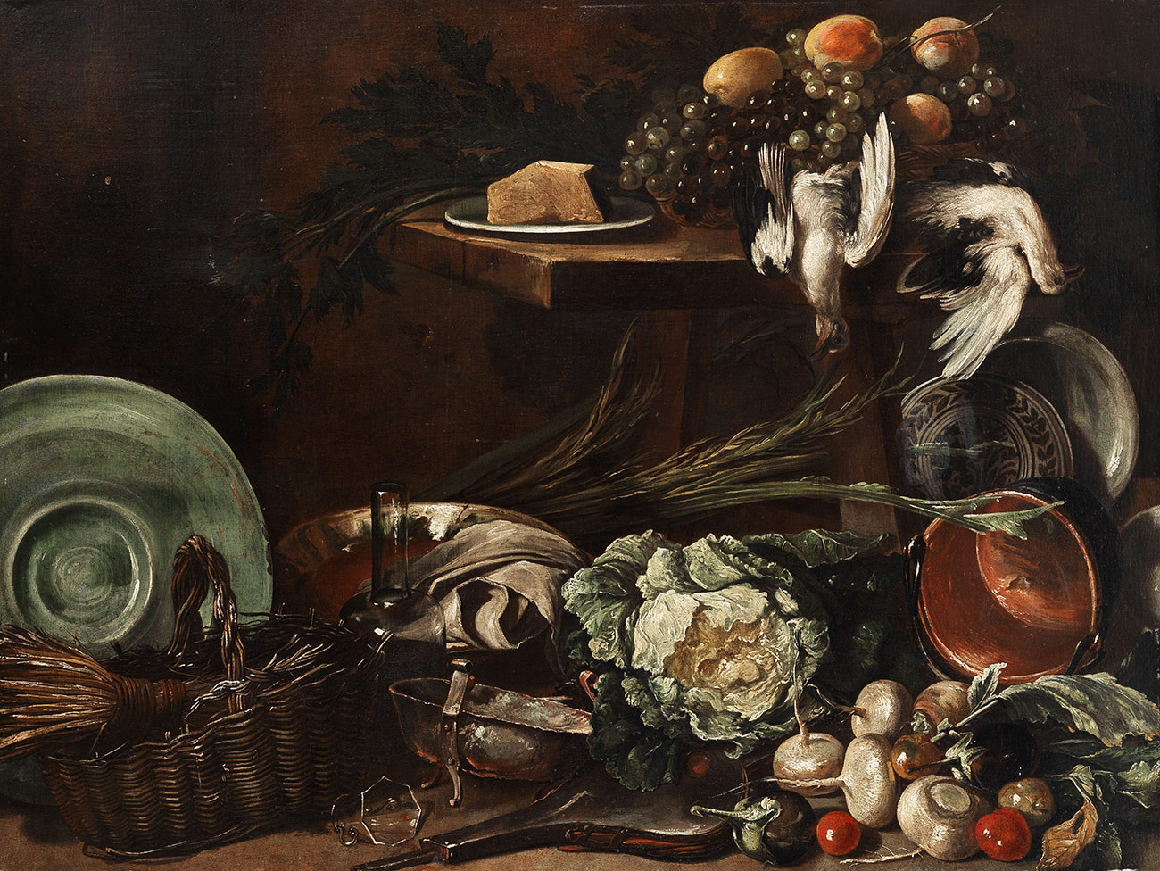 ₴ Репродукция натюрморт "Кухня с овощами, плита, мусор, дичь и виноград" - Рекко Джузеппе