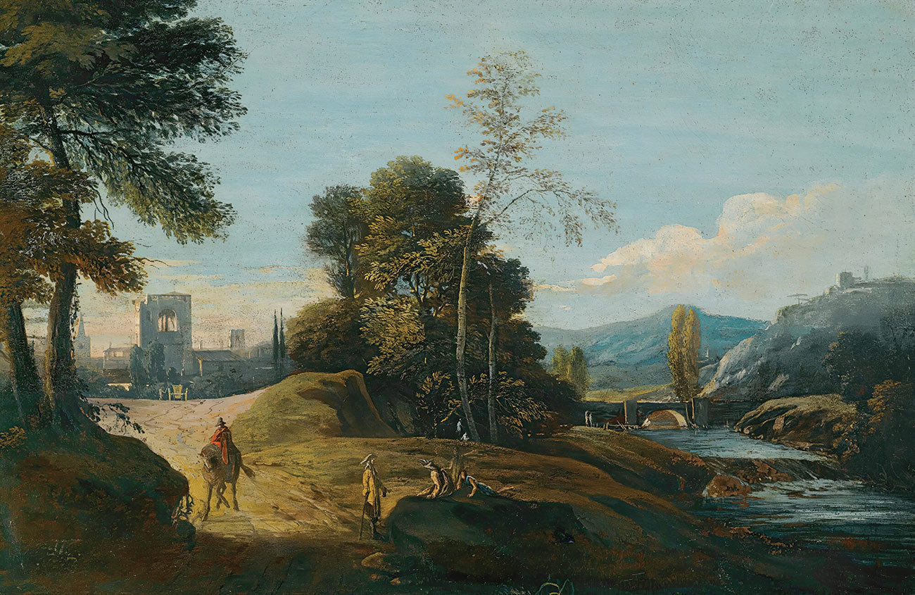 репродукция пейзажа художника Риччи Марко — "Речной пейзаж с фигурами на пути, город за его пределами"