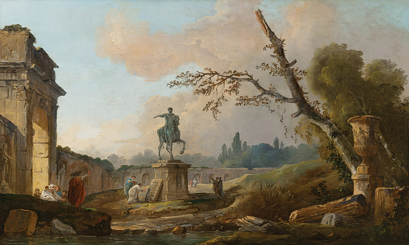 репродукция картины известного художника Робера Юбера - "Пейзаж с развалинами и статуей Марка Аврелия"