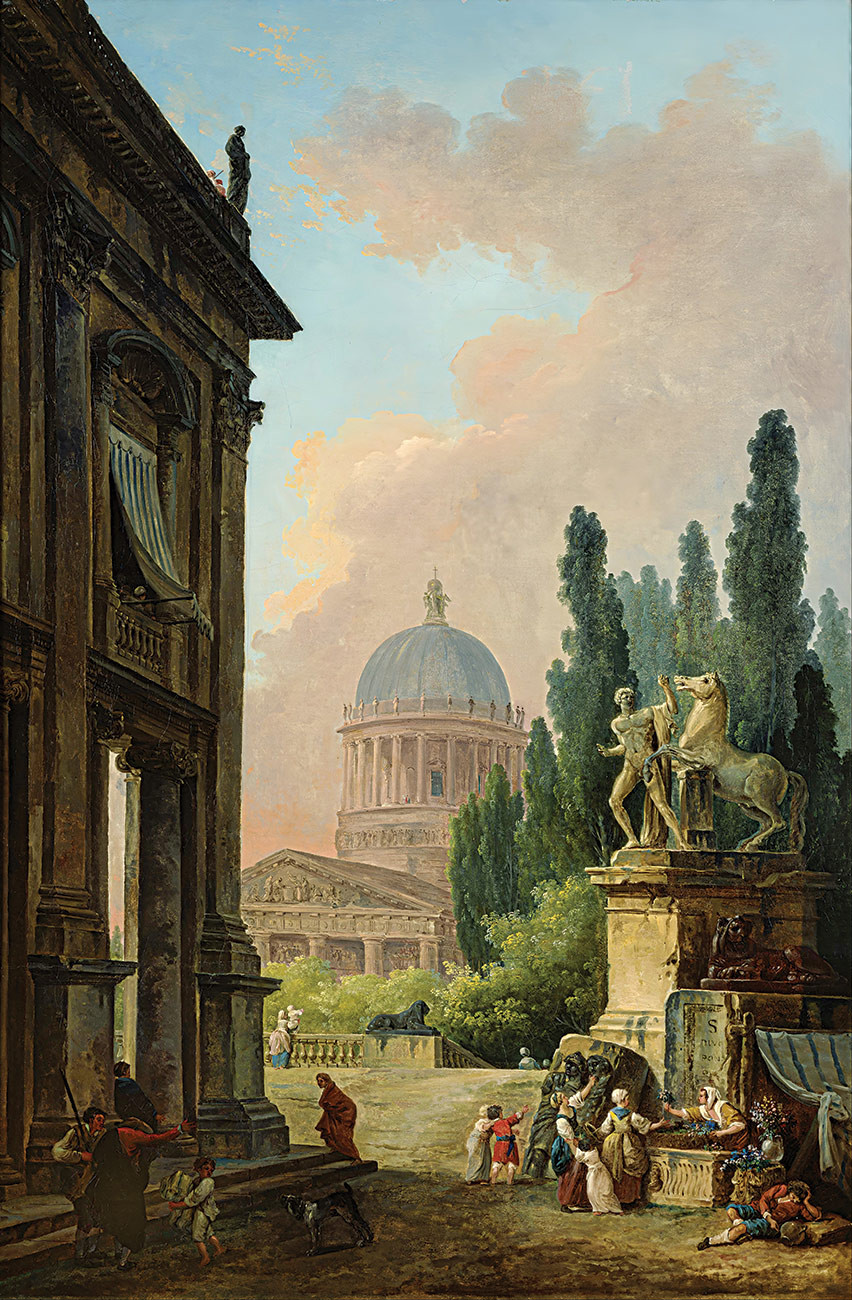 Картина Робера «Воображаемый вид Рима с укротителем лошадей Монте-Кавалло и церковью» — захватывающий пример его знаменитой архитектурной фантазии.