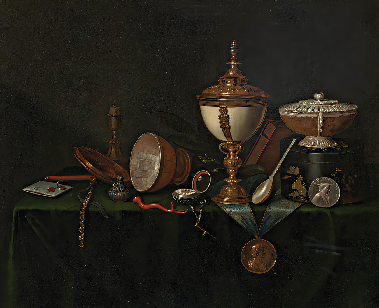 ₴ Репродукция натюрморт известного художника "Натюрморт с чашкой со страусиным яйцом и семейными реликвиями Уитфилдов" - Роэстратен Питер Герриц ван