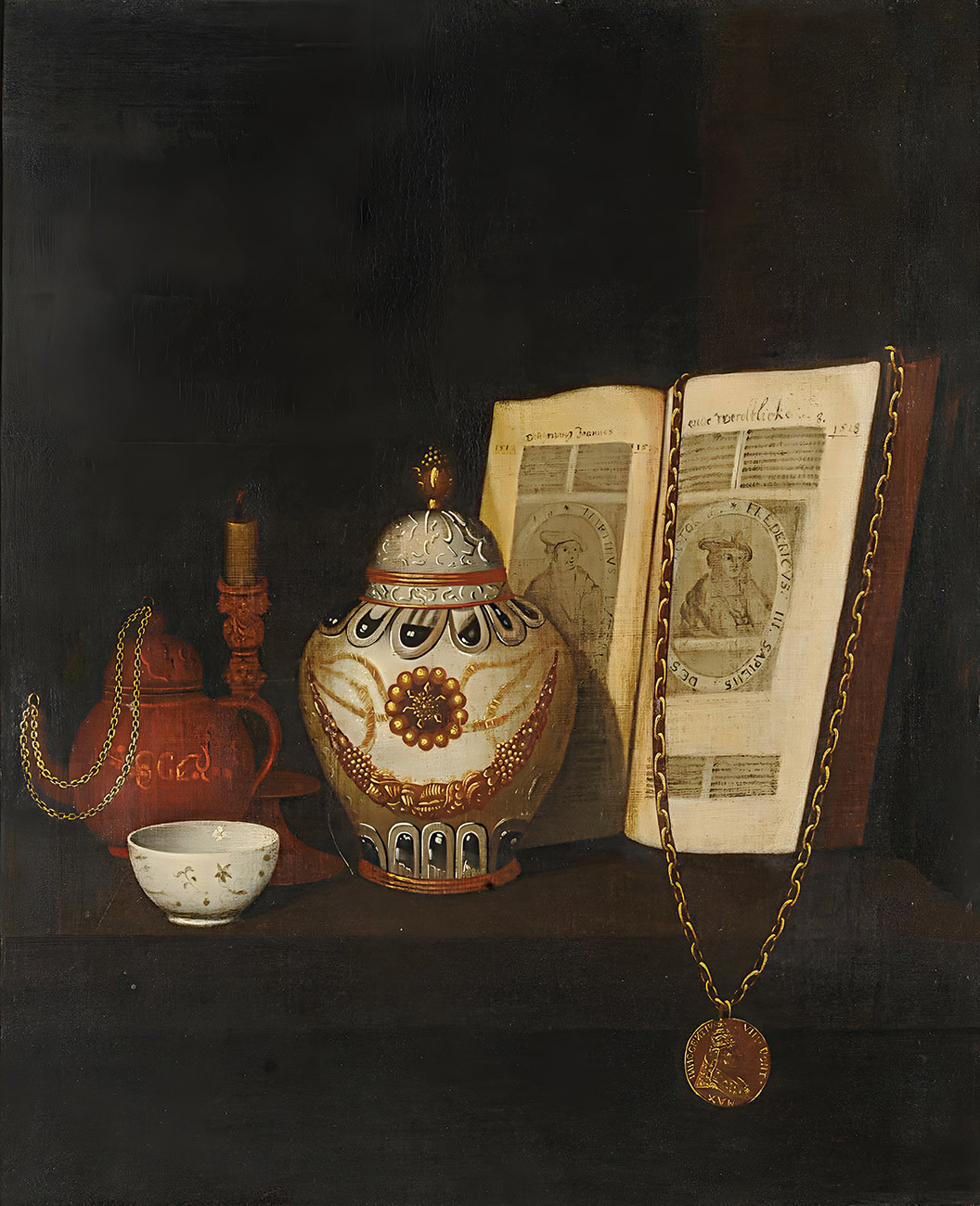₴ Репродукция натюрморт известного художника "Натюрморт с кувшином, золотой цепочкой, антикварной книгой и другими предметами" - Роэстратен Питер Герриц ван