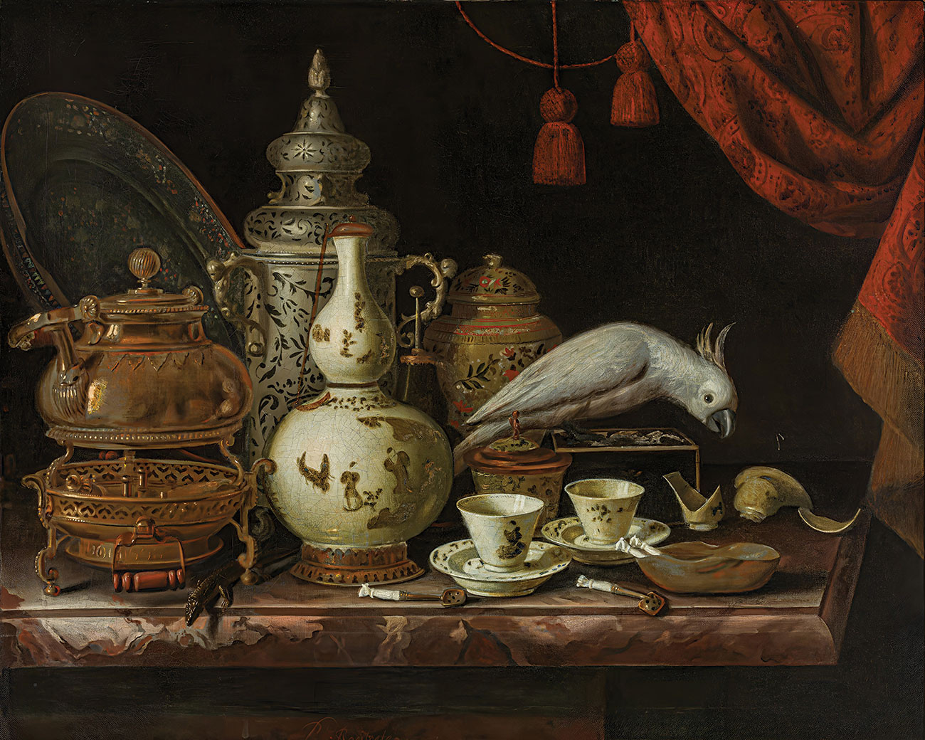 ₴ Репродукция натюрморт известного художника "Натюрморт с фарфором, серебром и какаду" - Роэстратен Питер Герриц ван