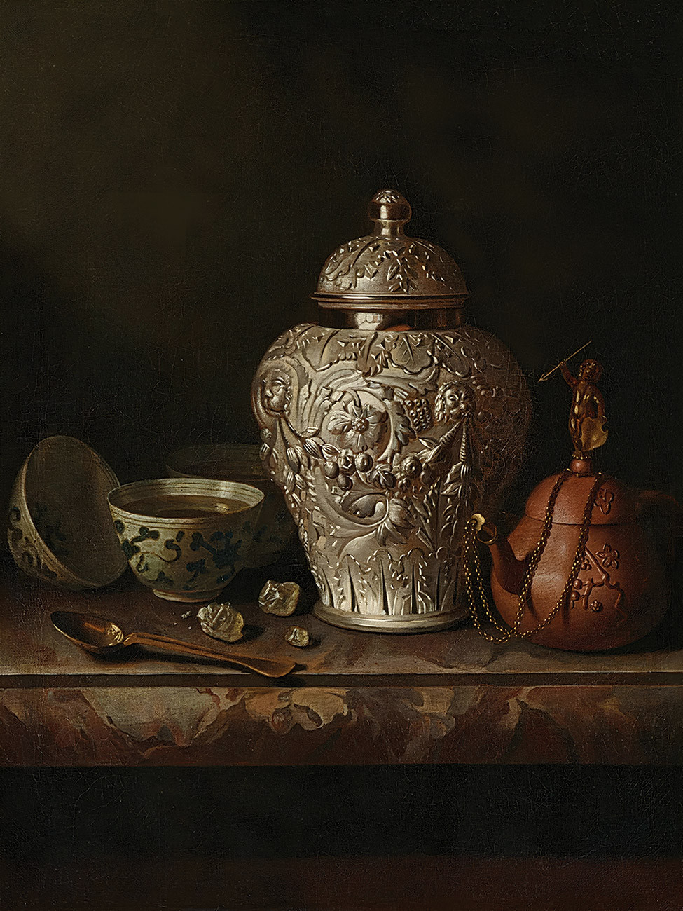 ₴ Репродукция натюрморт известного художника "Натюрморт с серебряной баночкой для имбиря, чайником и другими предметами на мраморной плите" - Роэстратен Питер Герриц ван