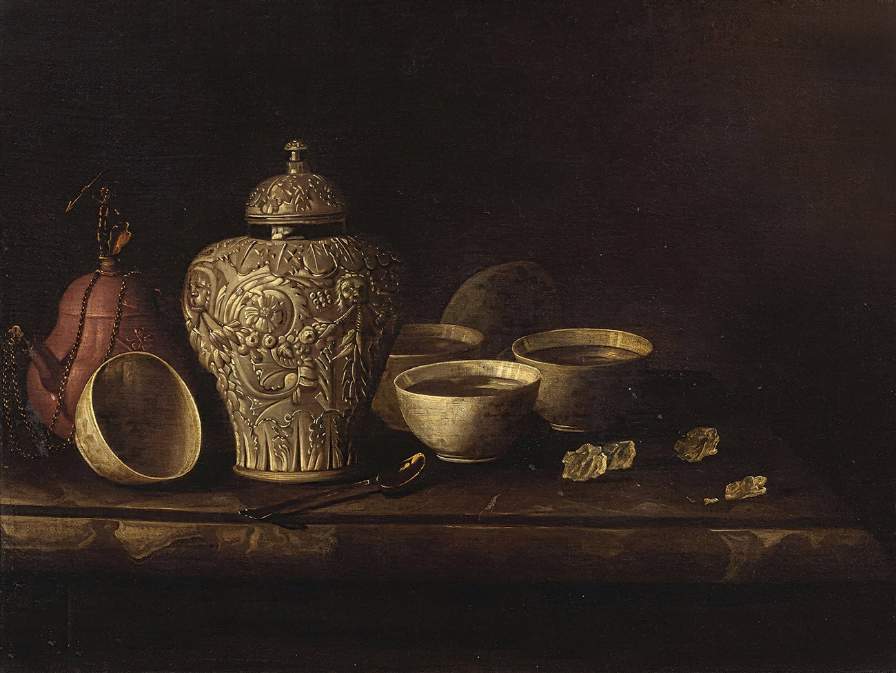 ₴ Репродукция натюрморт известного художника "Кувшин из матового серебра с крышкой, керамические чаши и чайник из каменной керамики на мраморном выступе" - Рохман Рулант