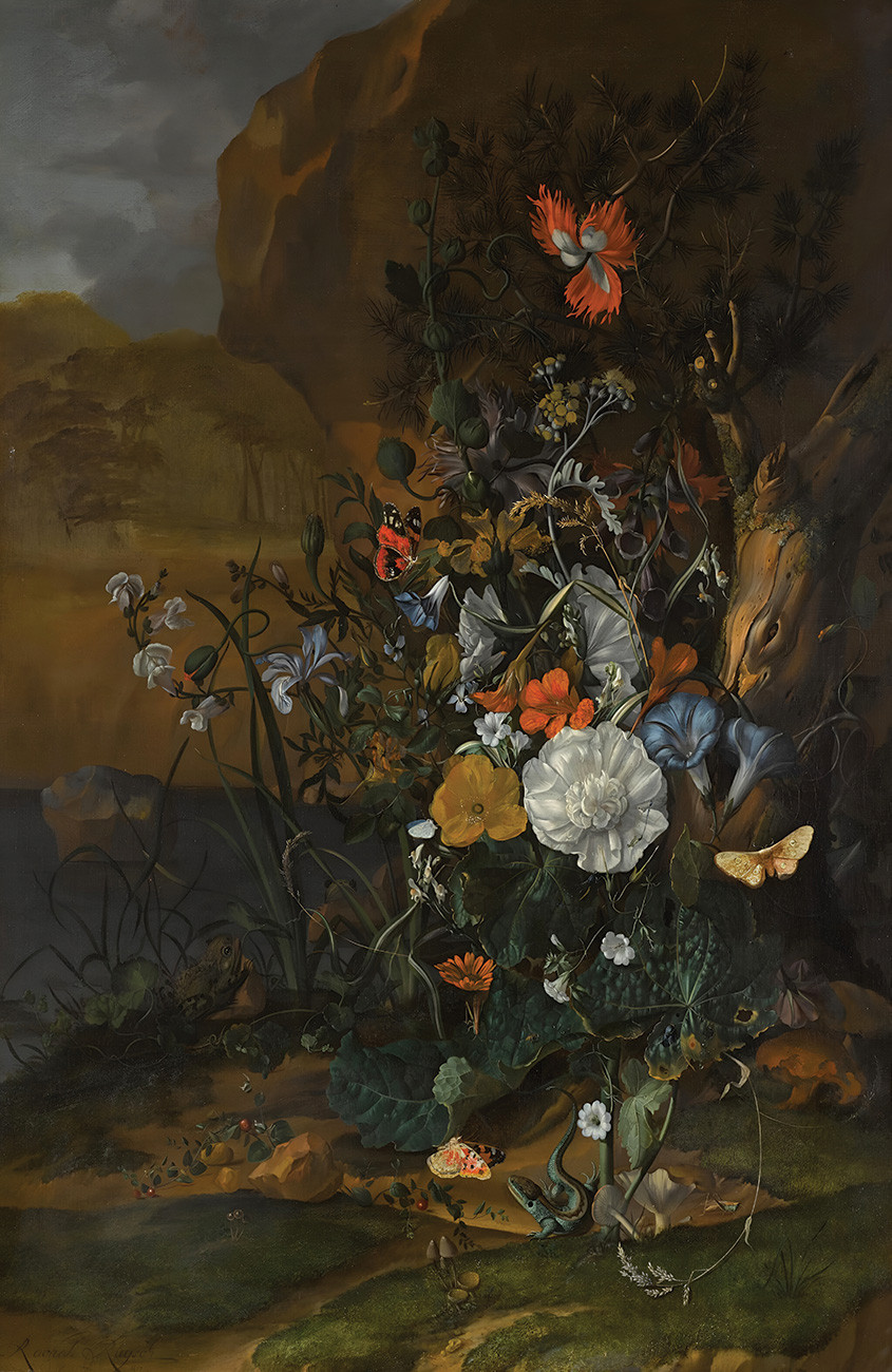 купите репродукцию цветочный натюрморт художниы Рюйш Рашель — "Натюрморт с цветами, бабочками, насекомыми, ящерицей и жабами у пруда"