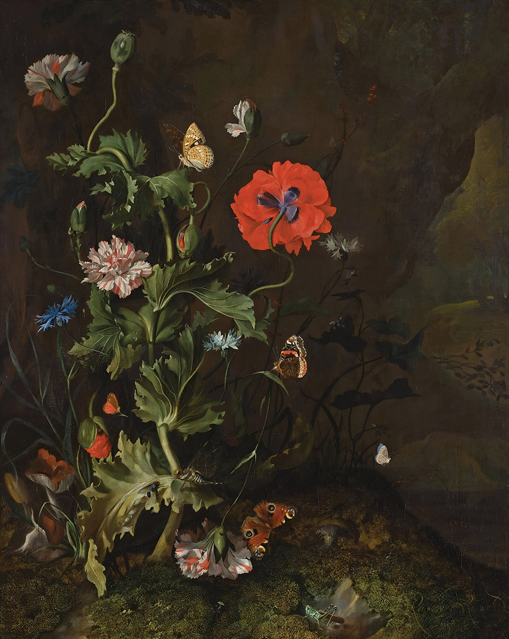 купите репродукцию цветочный натюрморт художниы Рюйш Рашель — "Чертополох между гвоздиками и васильками на покрытой мхом лесной подстилке, с бабочками и сверчком"