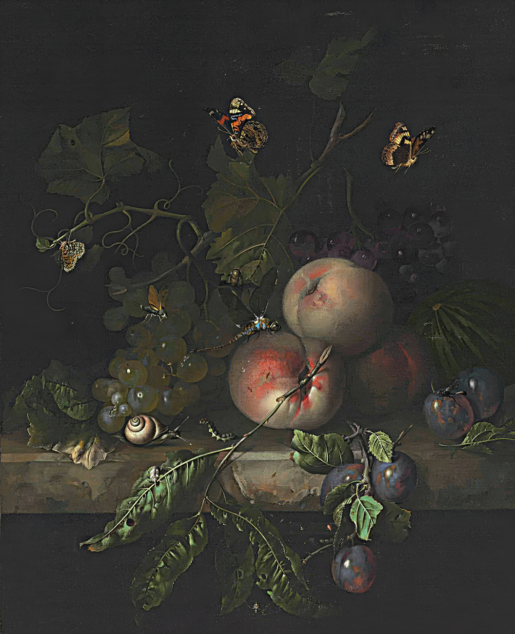 купите репродукцию цветочный натюрморт художниы Рюйш Рашель — "Персики, виноград и сливы со стрекозой, улиткой, гусеницей, мотыльками и другими насекомыми на каменном выступе"