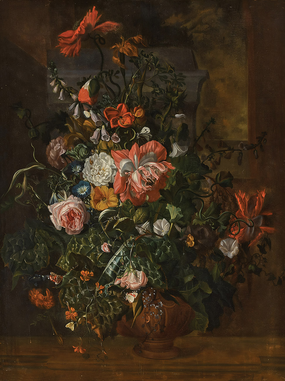 купите репродукцию цветочный натюрморт художниы Рюйш Рашель — "Натюрморт с цветами в терракотовой вазе"