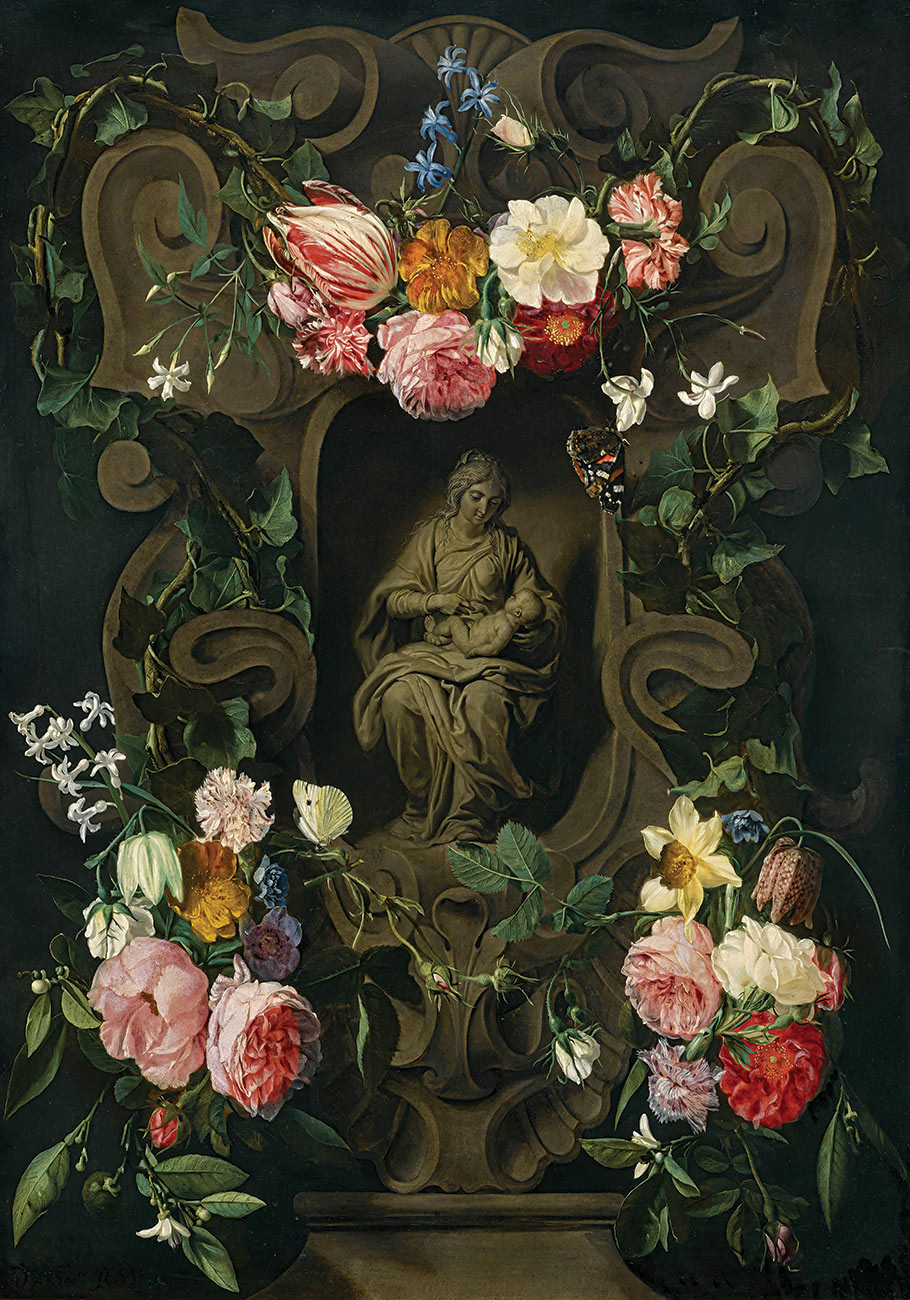 купите репродукцию натюрморт художника Сегерса Даниэля — "Мадонна с младенцем в картуше, окруженная цветами"